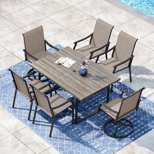 Captiva Designs 9 件套宽敞板顶矩形金属桌,带伞孔和棕色 Textilene 固定椅子