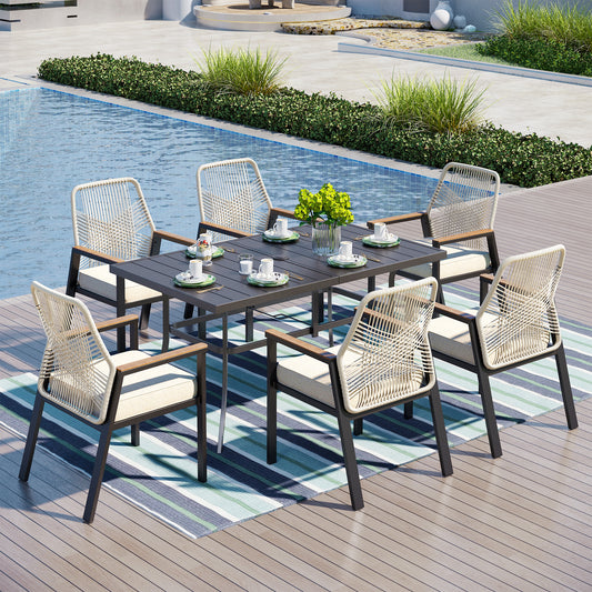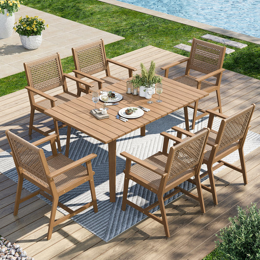 Captiva Designs 7pc Outdoor Dining Rectangular Slat-top Steel Table with Umbrella Hole & Beige Rattan Fixed Chairs