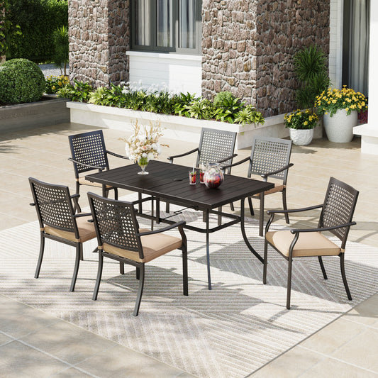 Captiva Designs 7 件套露台餐桌椅套装,配有带板顶的矩形桌子和带剥离式靠背的金属可堆叠椅子