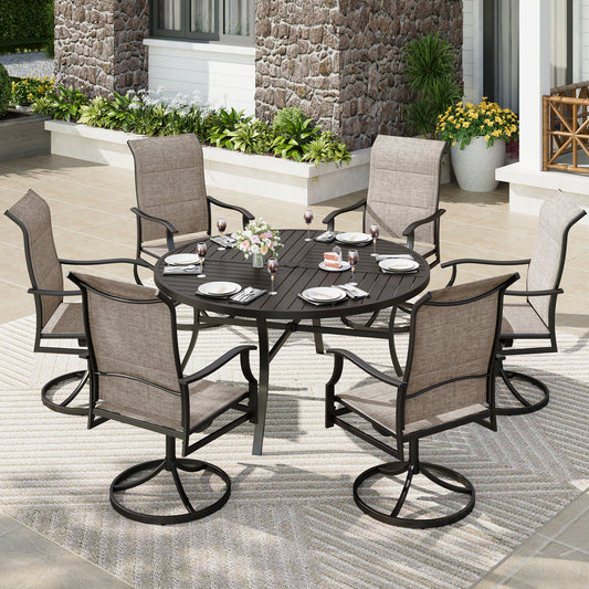 Captiva Designs 7 件套黑色圆形板条钢桌,带伞孔和灰棕色软垫 Textilene 椅子