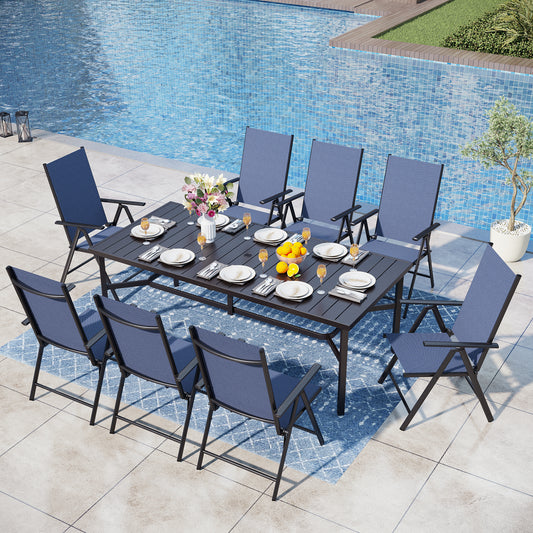 Captiva Designs 9 件套宽敞方形金属板顶桌,带伞孔和带衬垫的 Textilene 旋转椅