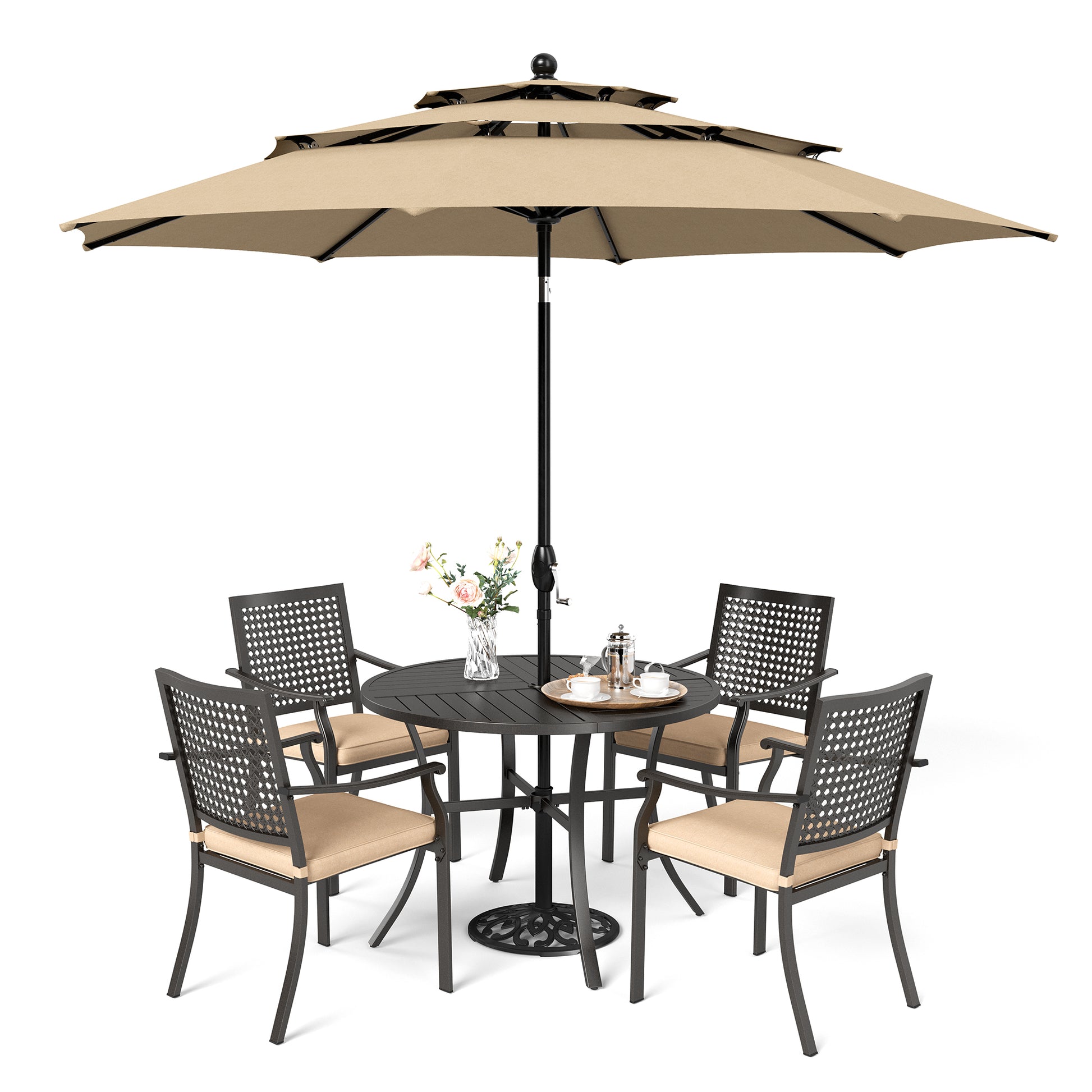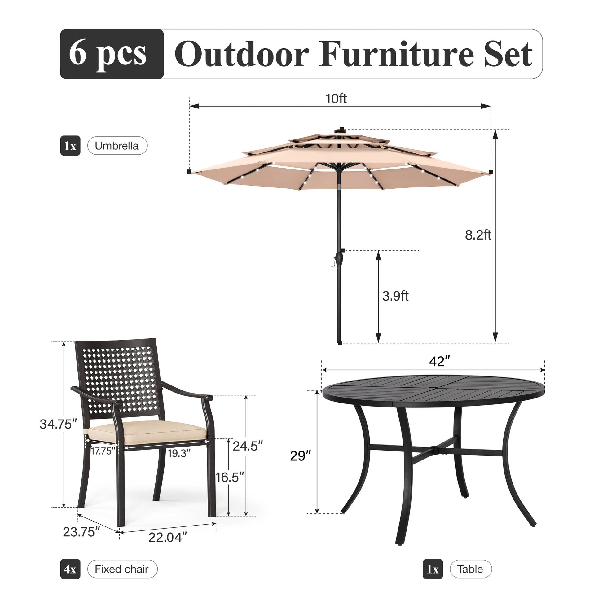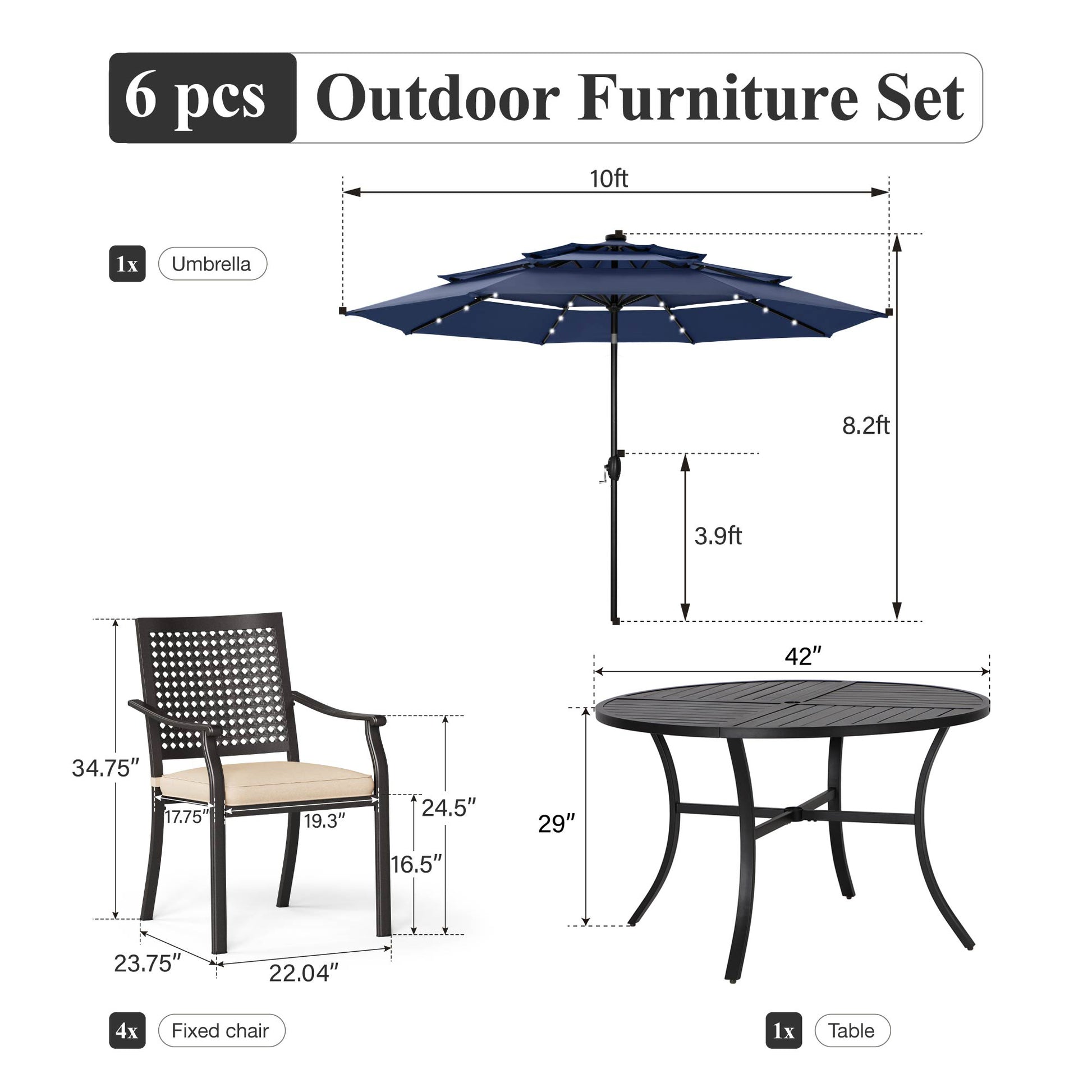 [CAPTIVA DESIGNS] Create an inviting outdoor dining experience with our six-piece collection, featuring a weather-resistant metal round table and cushioned metal chairs. The included market umbrella provides shade for a refined, all-in-one solution that balances durability with style.