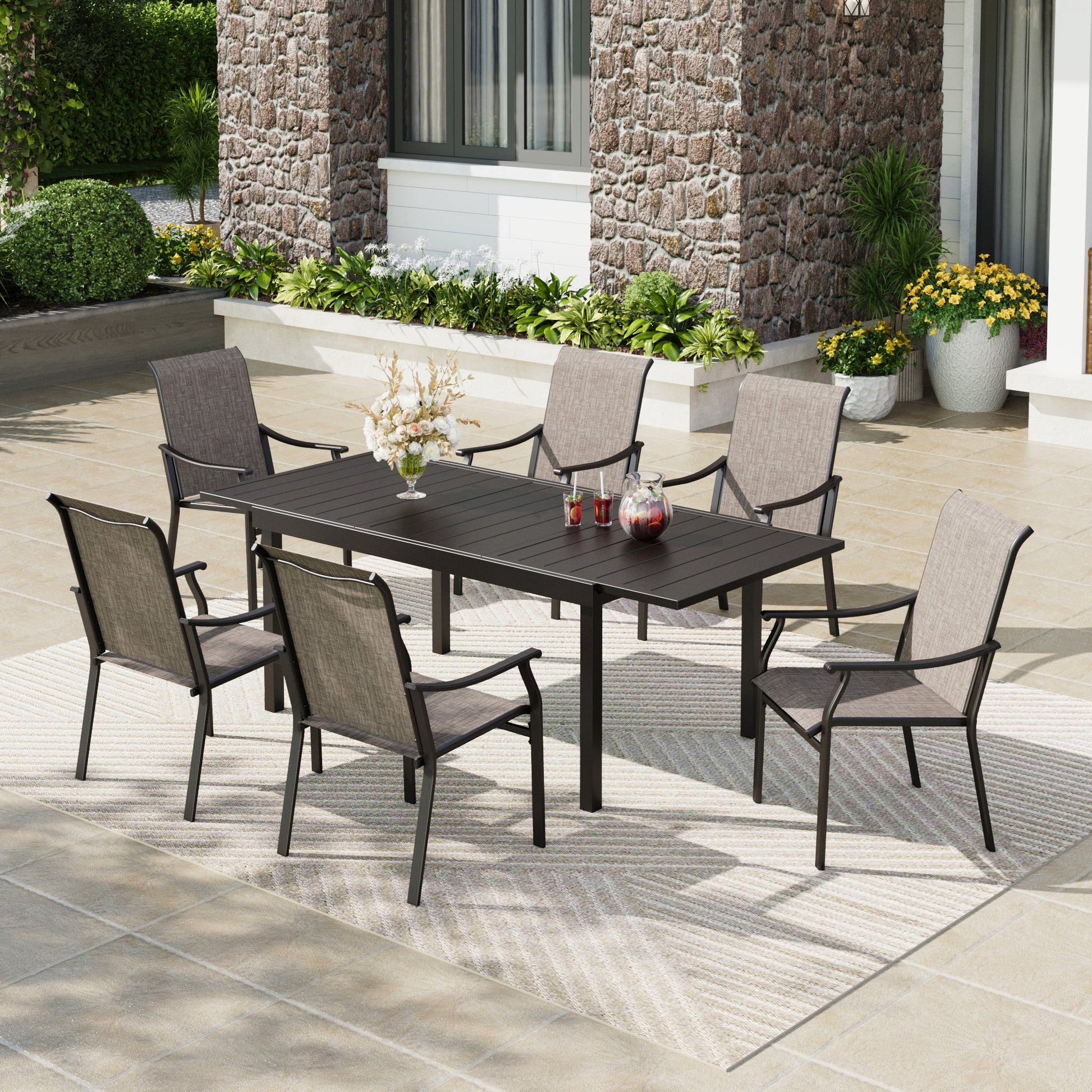 Upgrade your outdoor dining with our 7-Piece Outdoor Dining Set, featuring a spacious 54" Round Table that comfortably seats 6 guests. The stylish slat tabletop is easy to maintain and includes a 1.57" umbrella hole for shade on sunny days.