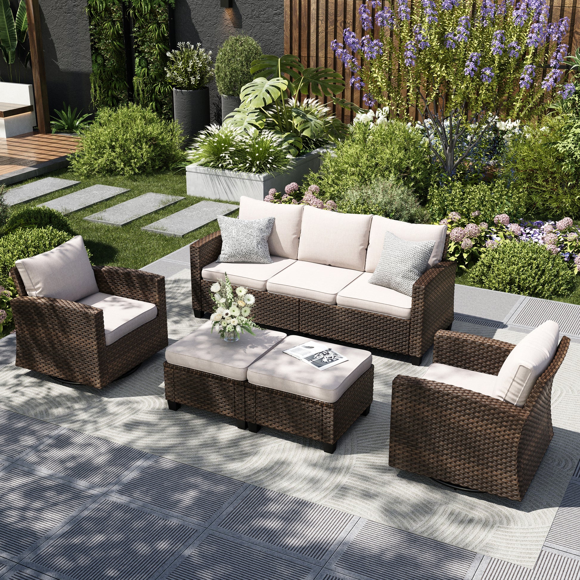 Captiva Designs 5 件套户外露台柳条会客套装,带软垫藤条旋转椅,适用于花园泳池边后院