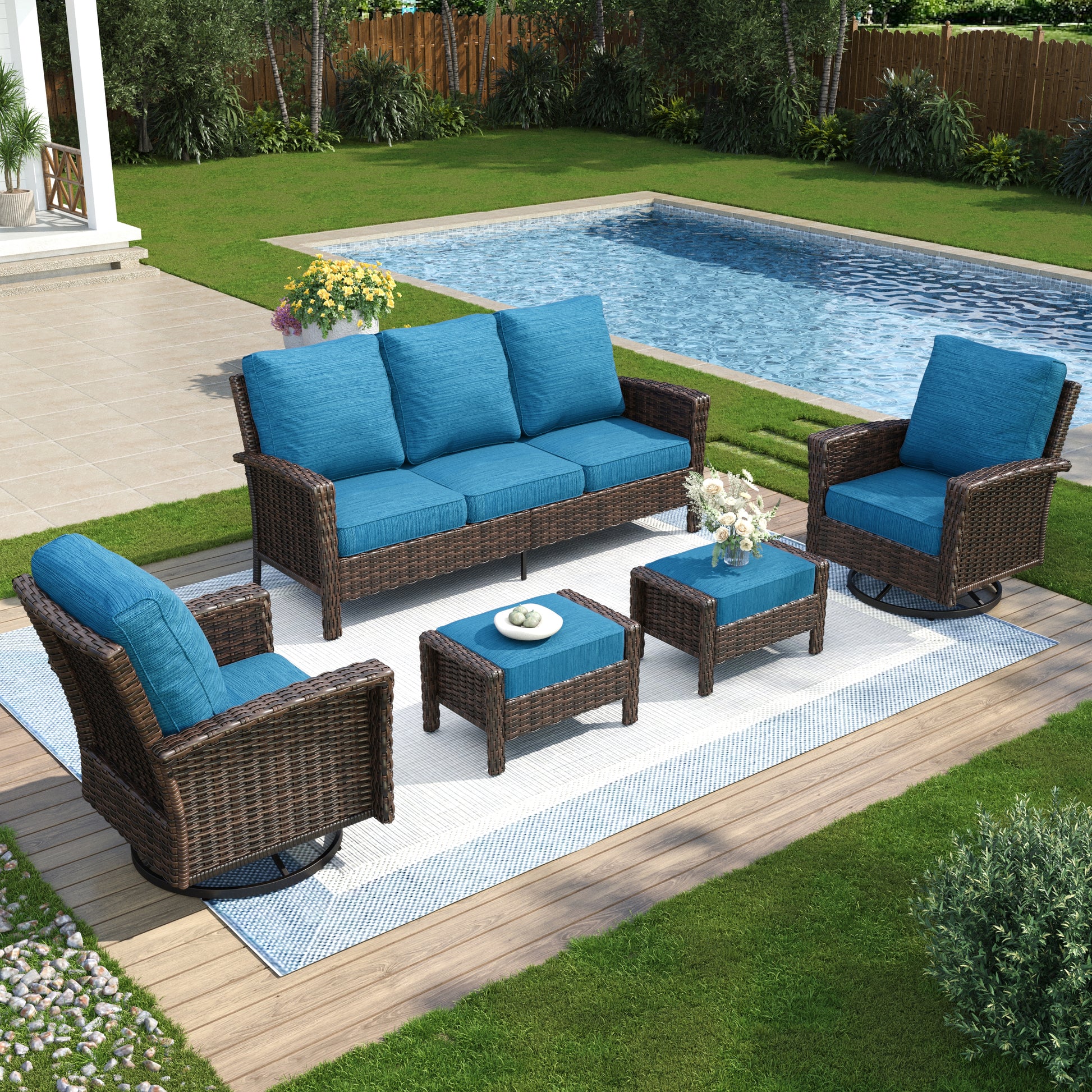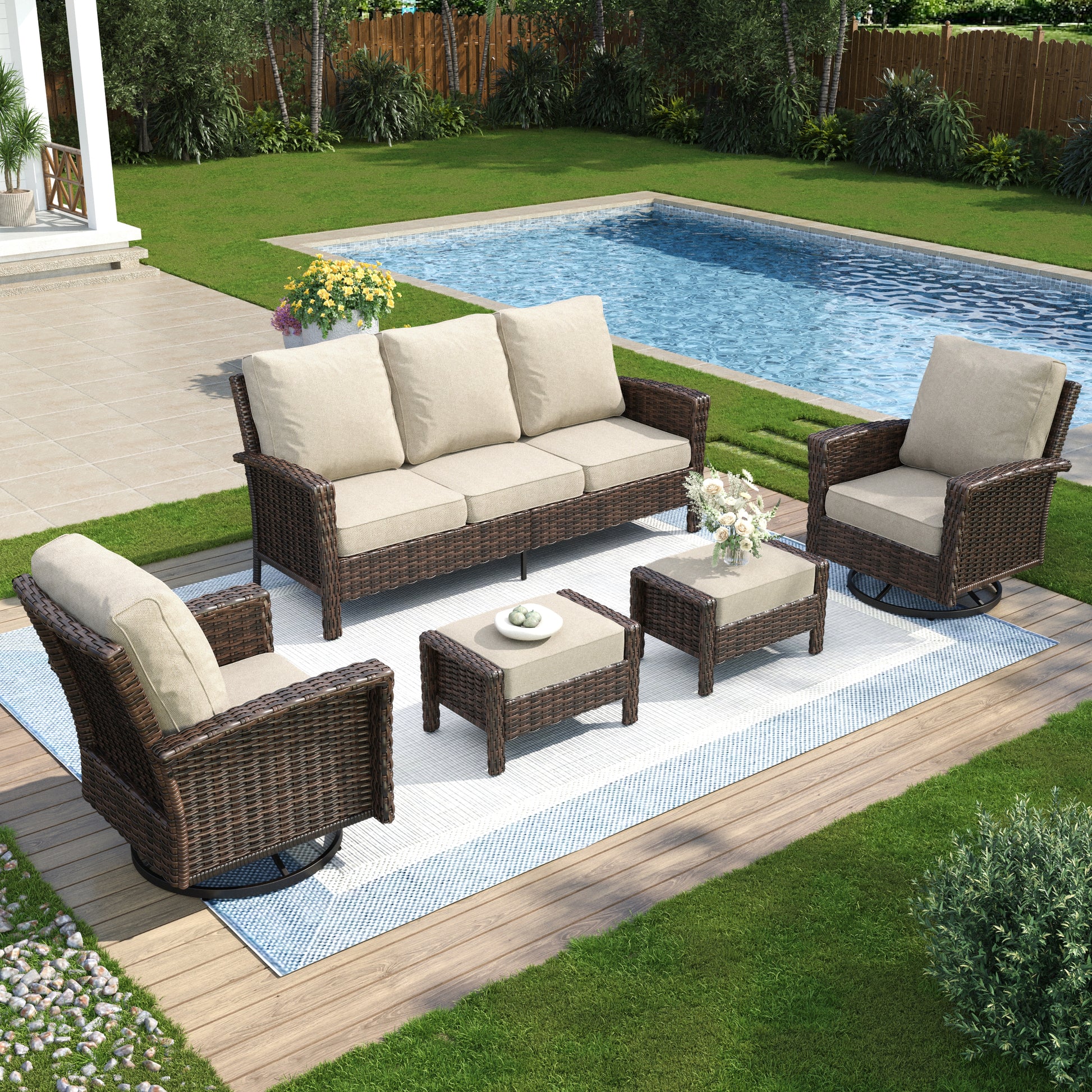 Captiva Designs 5 件套超大露台户外柳条家具会客沙发套装带脚凳适用于花园庭院门廊