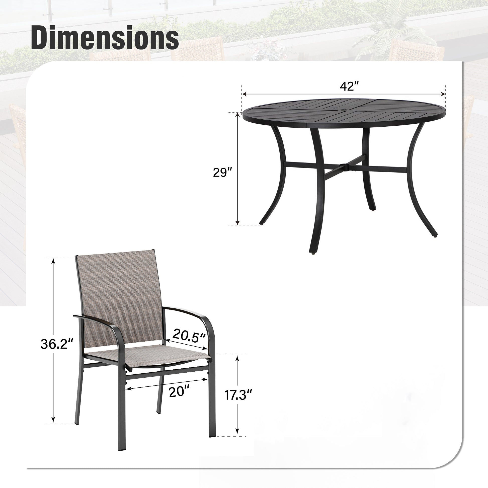 <b>增强座椅舒适度:</b>我们的 5 件户外餐桌套装提供更大的座位,为户外聚会期间的深度放松提供宽敞舒适的环境。