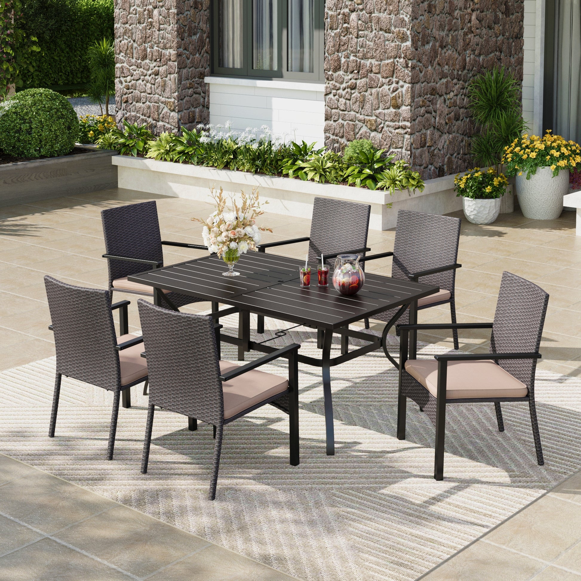 Upgrade your outdoor dining with our 7-Piece Outdoor Dining Set, featuring a spacious 54" Round Table that comfortably seats 6 guests. The stylish slat tabletop is easy to maintain and includes a 1.57" umbrella hole for shade on sunny days.