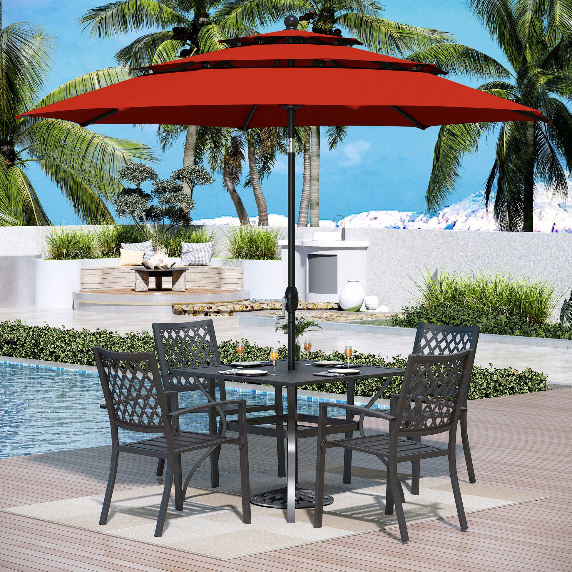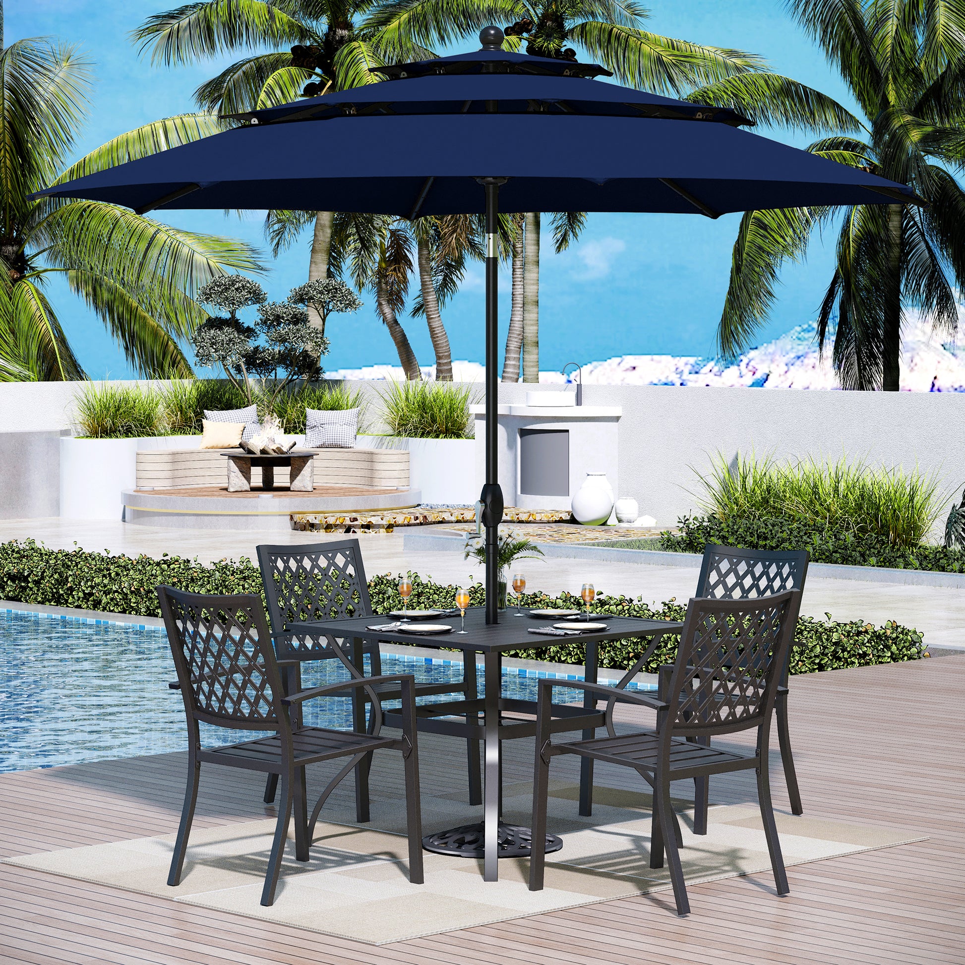 Captiva Designs 6 件套露台板顶方桌和可叠放固定椅子以及海军蓝 10 英尺 3 层自动倾斜遮阳伞