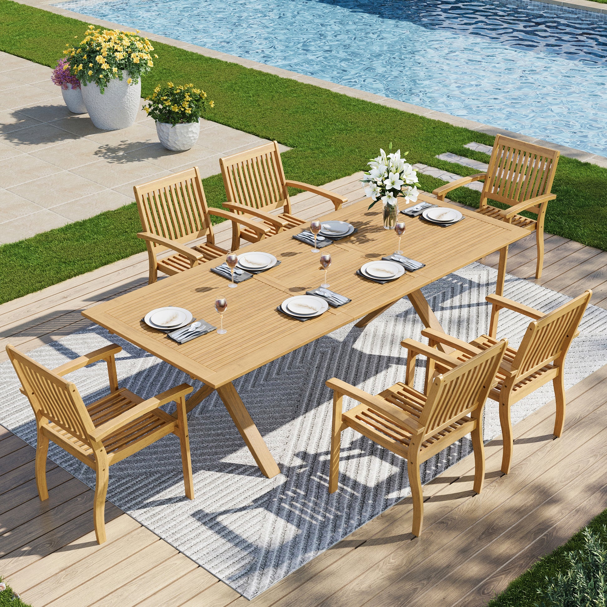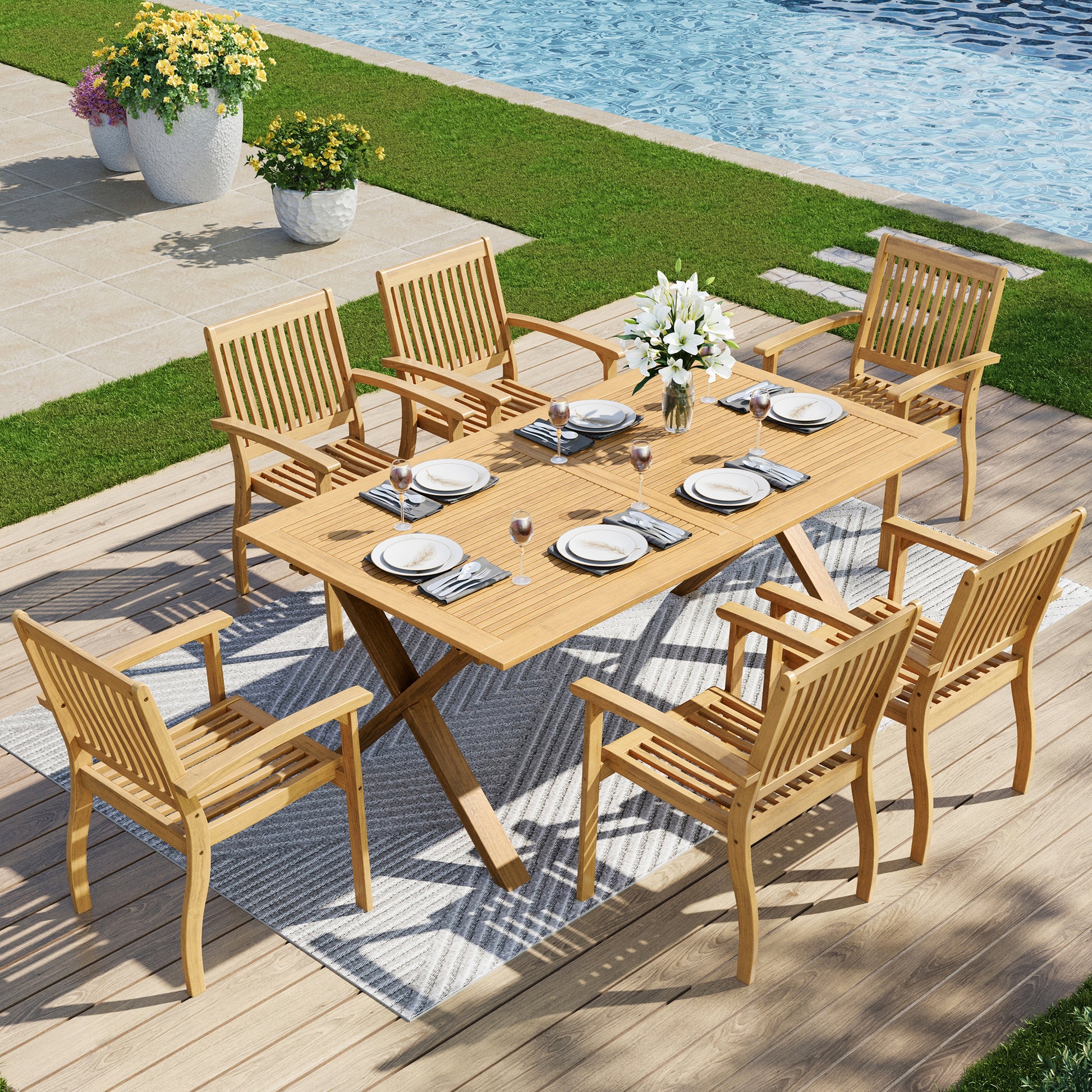 Captiva Designs 7 件套相思木露台家具套装,配有可扩展桌子和软垫椅子
