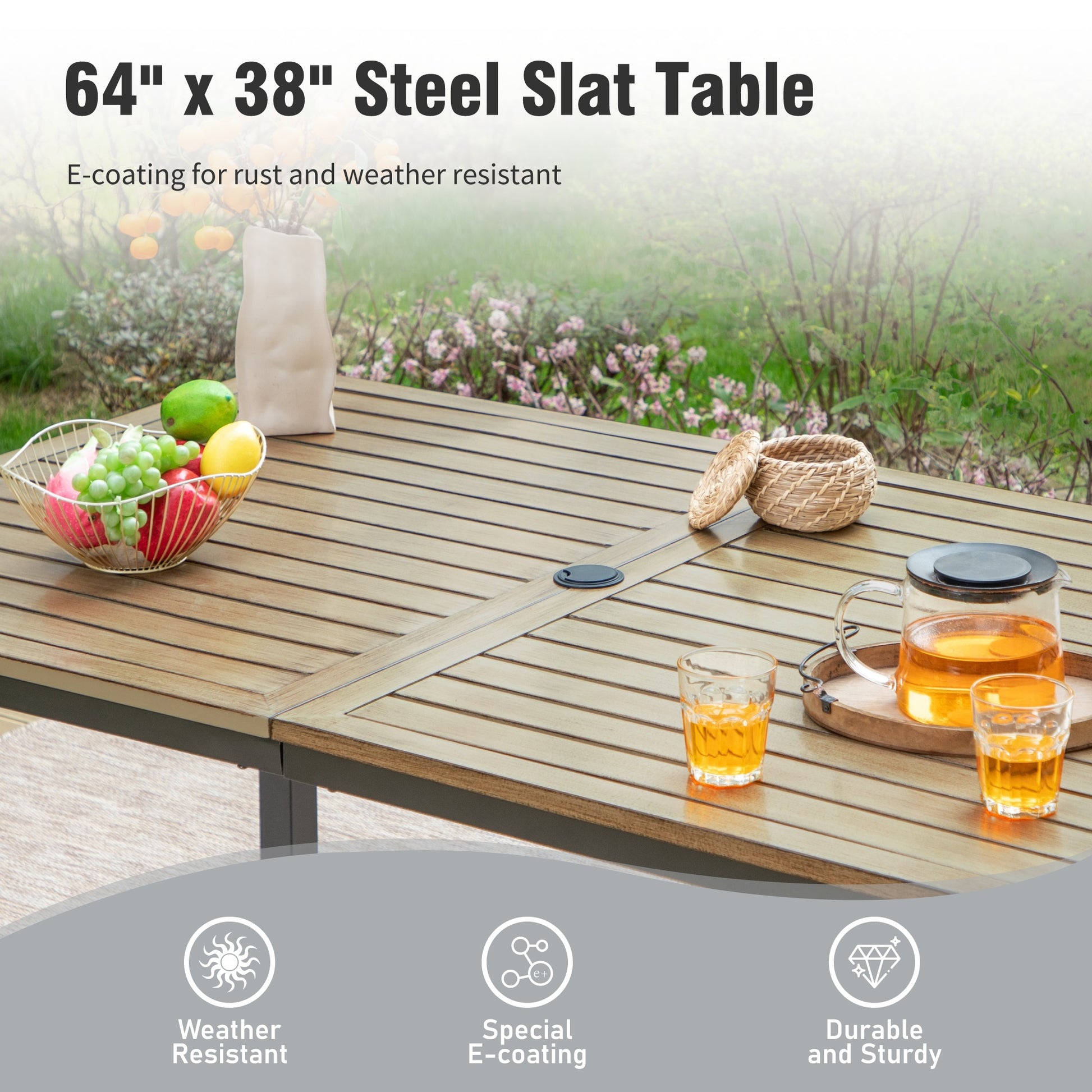 [CAPTIVA DESIGNS] Enjoy outdoor dining with the Captiva Designs 7pc Patio Set. The slatt-top metal table features an umbrella hole for shade while the textilene reclining chairs provide comfort and relaxation. With a wood-look design, this set adds a touch of elegance to any patio. Easily foldable for storage and low maintenance.