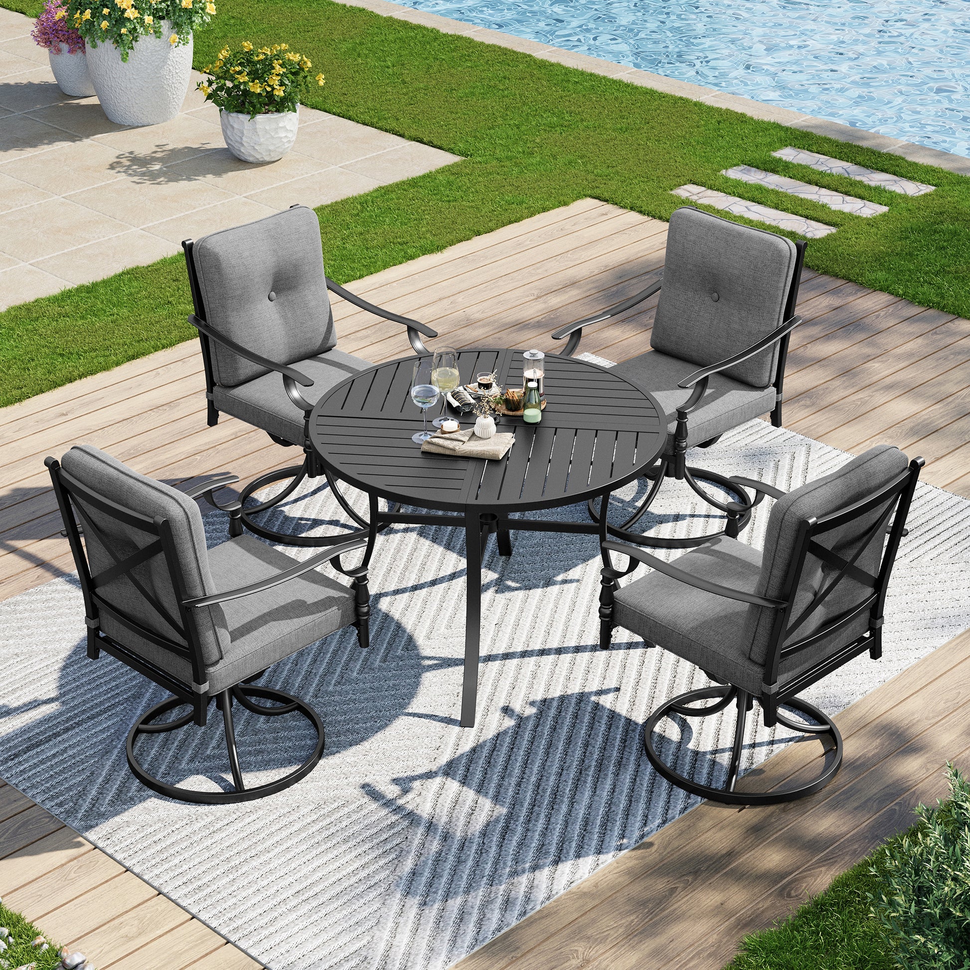 - The slat design promotes water drainage while maintaining a sophisticated aesthetic, while the metal frame construction ensures lasting stability against the elements. Ideal for creating an inviting dining destination on your patio, deck, or garden space.