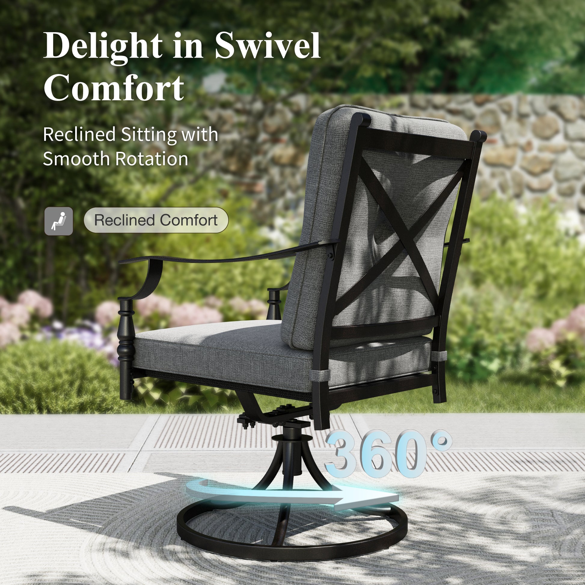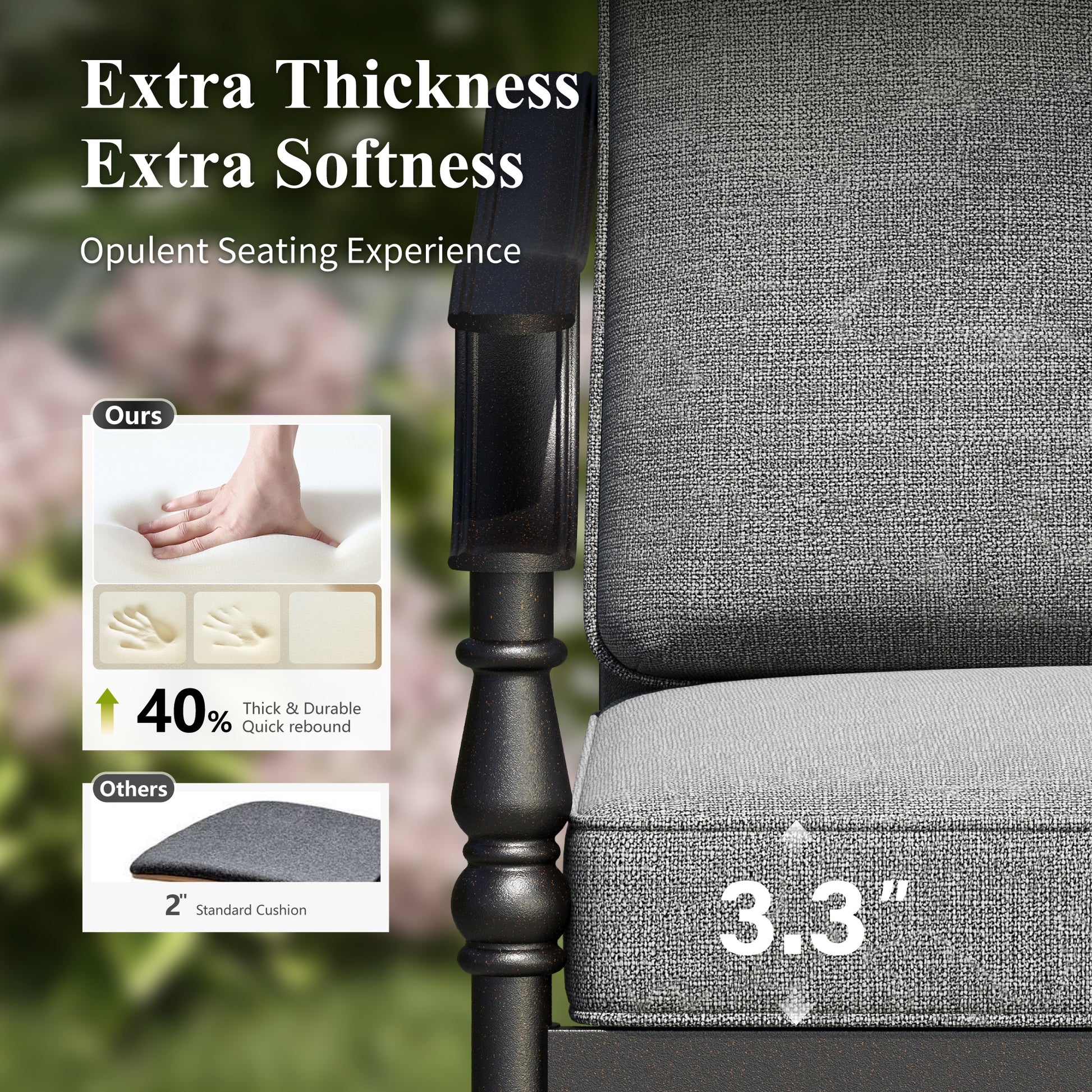 - Seat Cushion Thickness: 3.3", Back Cushion Thickness: 4.3"
