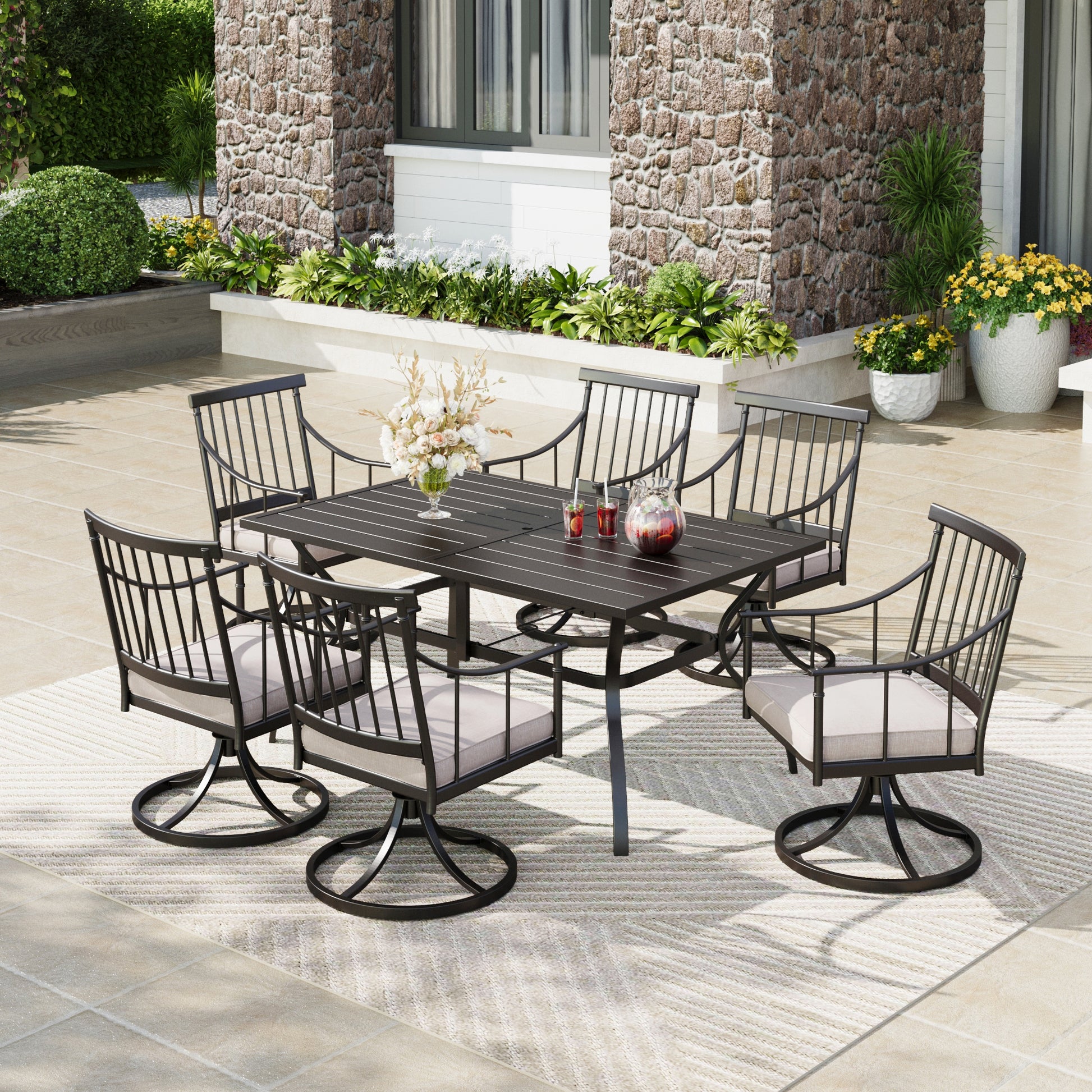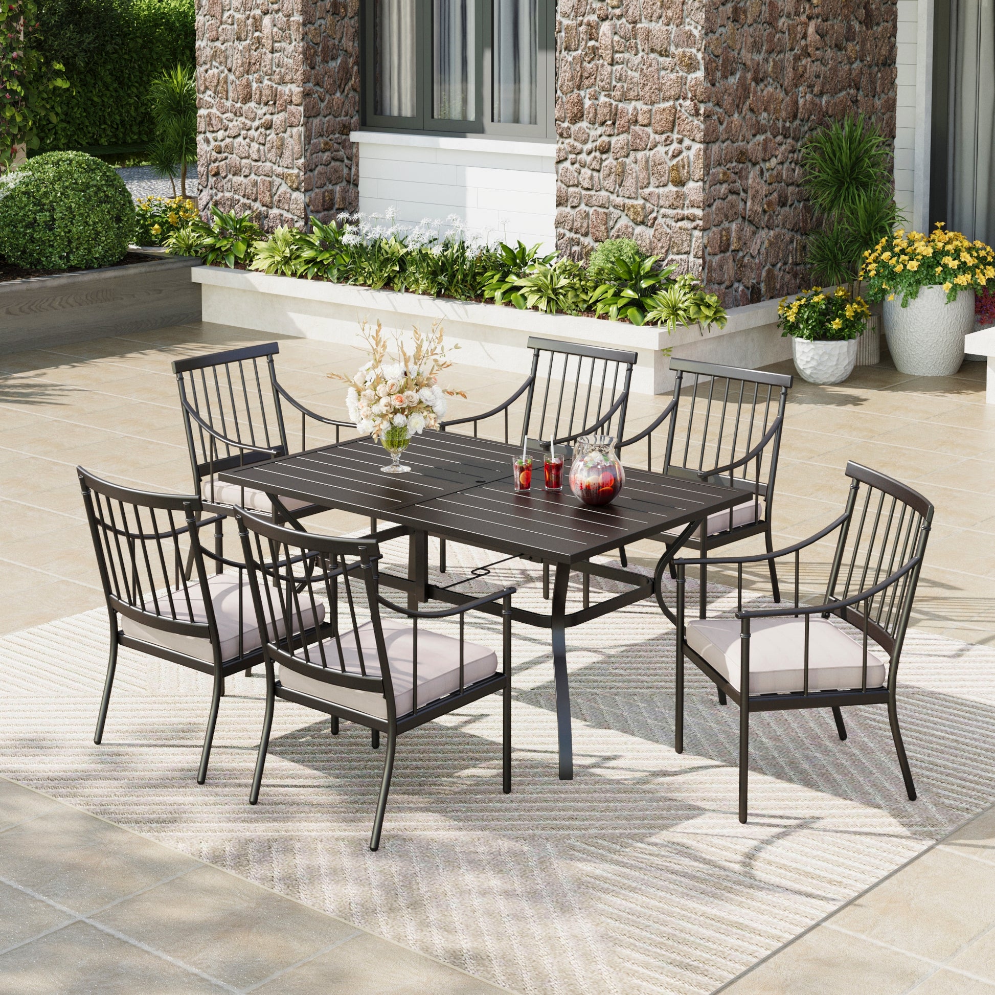 [<b>CAPTIVA DESIGNS</b>] 使用我们的 7 件套户外餐桌套装提升您的户外空间,它是现代户外生活的典范。这款金属矩形桌子专为现代生活而设计,配有板条桌面和随时可用的伞孔。
