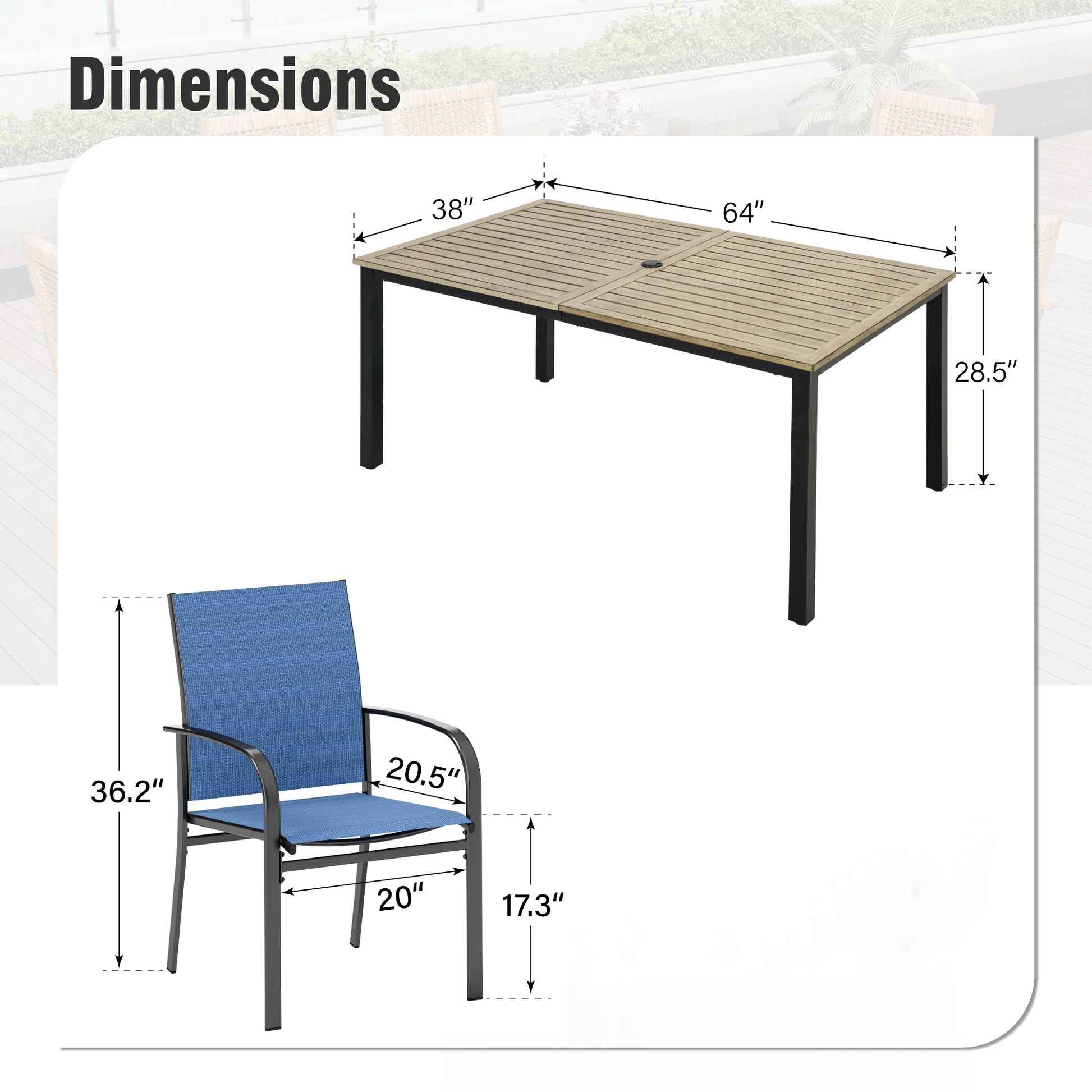 [<b>CAPTIVA DESIGNS</b>] 使用我们的 7 件套露台餐桌套装升级您的户外餐桌,该套装采用优质金属框架和仿木桌面,并配有 1.57 英寸伞孔。该桌子外观质朴,采用耐用的仿木纹饰面、板条桌面和U 形桌腿。