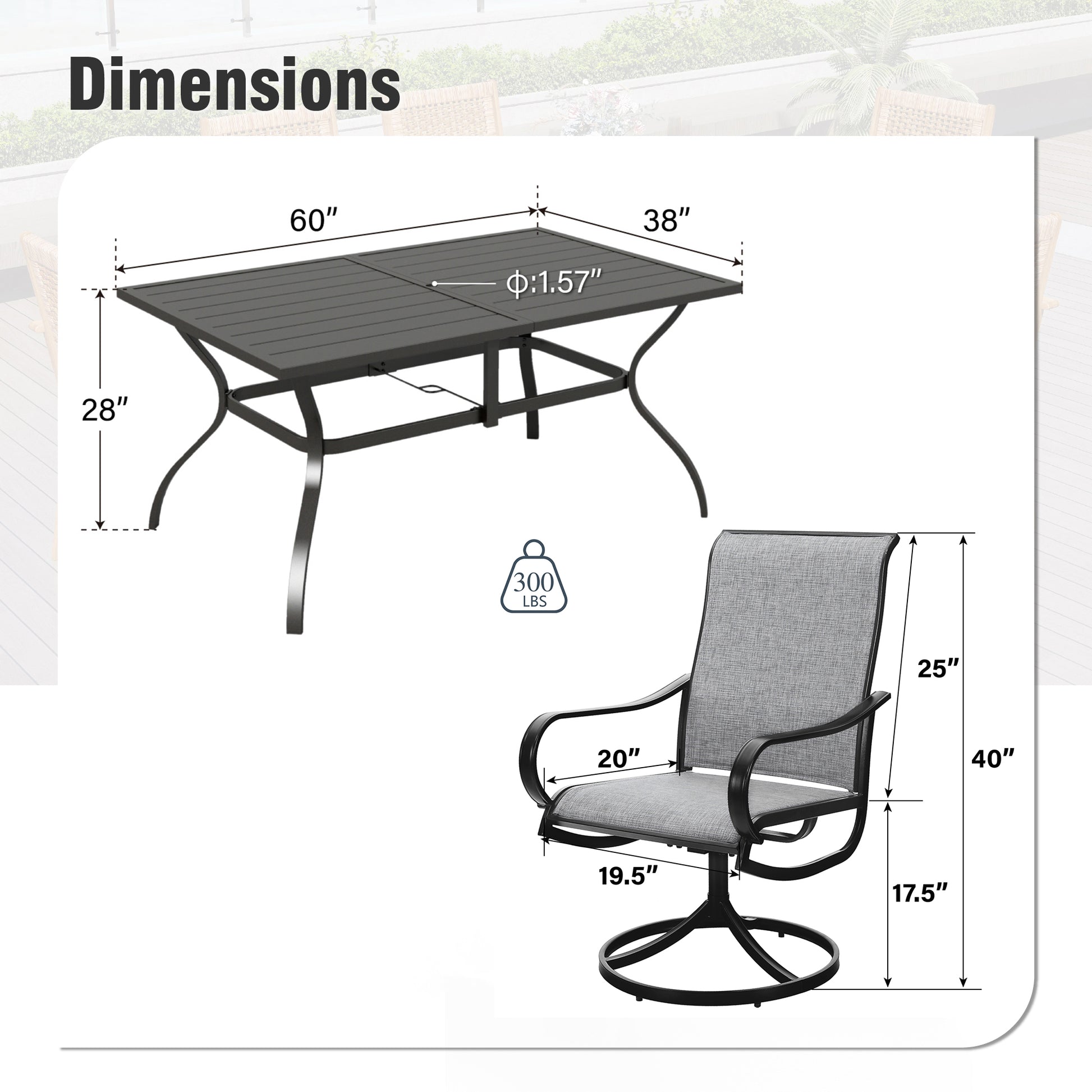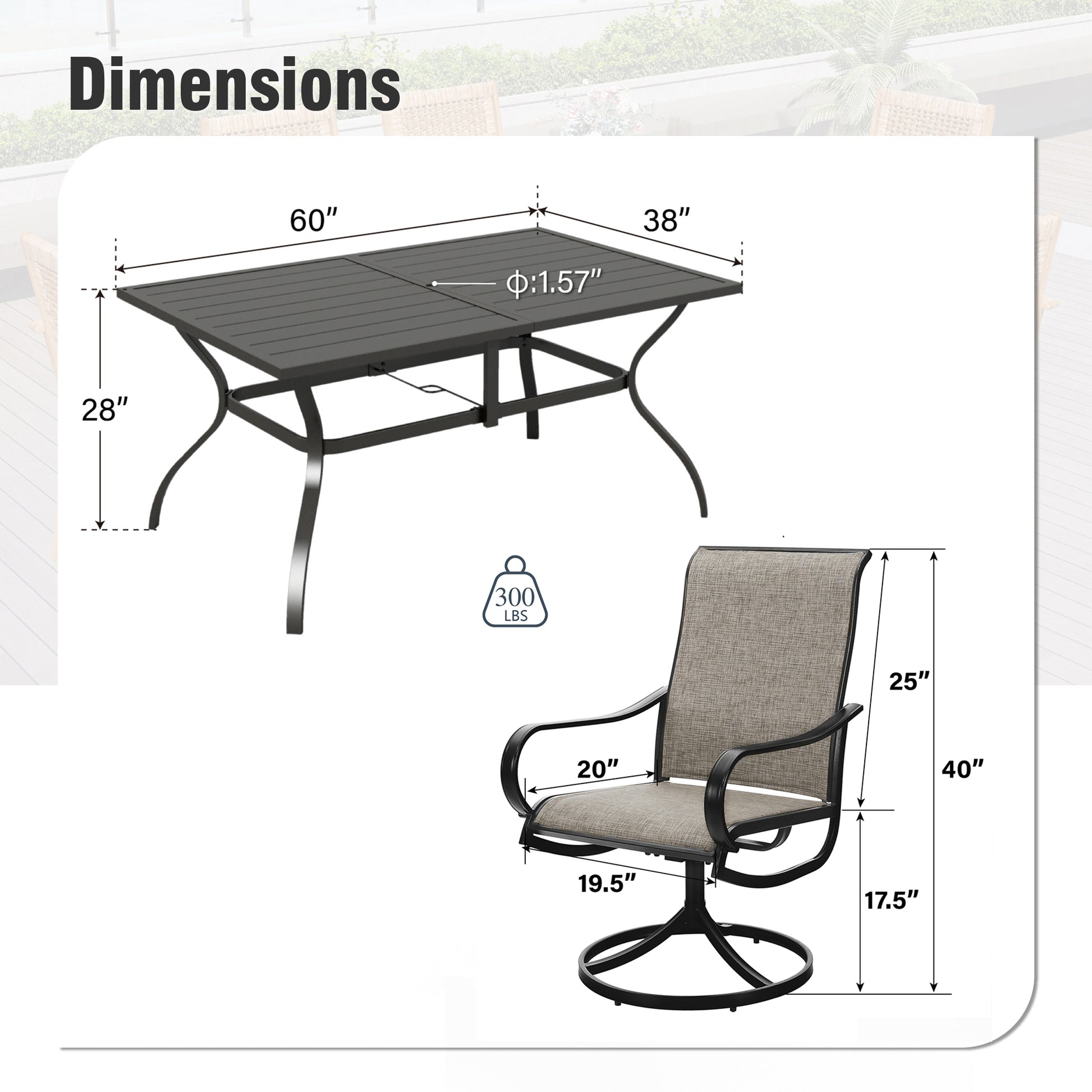 [<b>CAPTIVA DESIGNS</b>] 使用我们的 7 件套户外餐桌套装提升您的户外空间,它是现代户外生活的典范。这款金属矩形桌子专为现代生活而设计,配有板条桌面和随时可用的伞孔。
