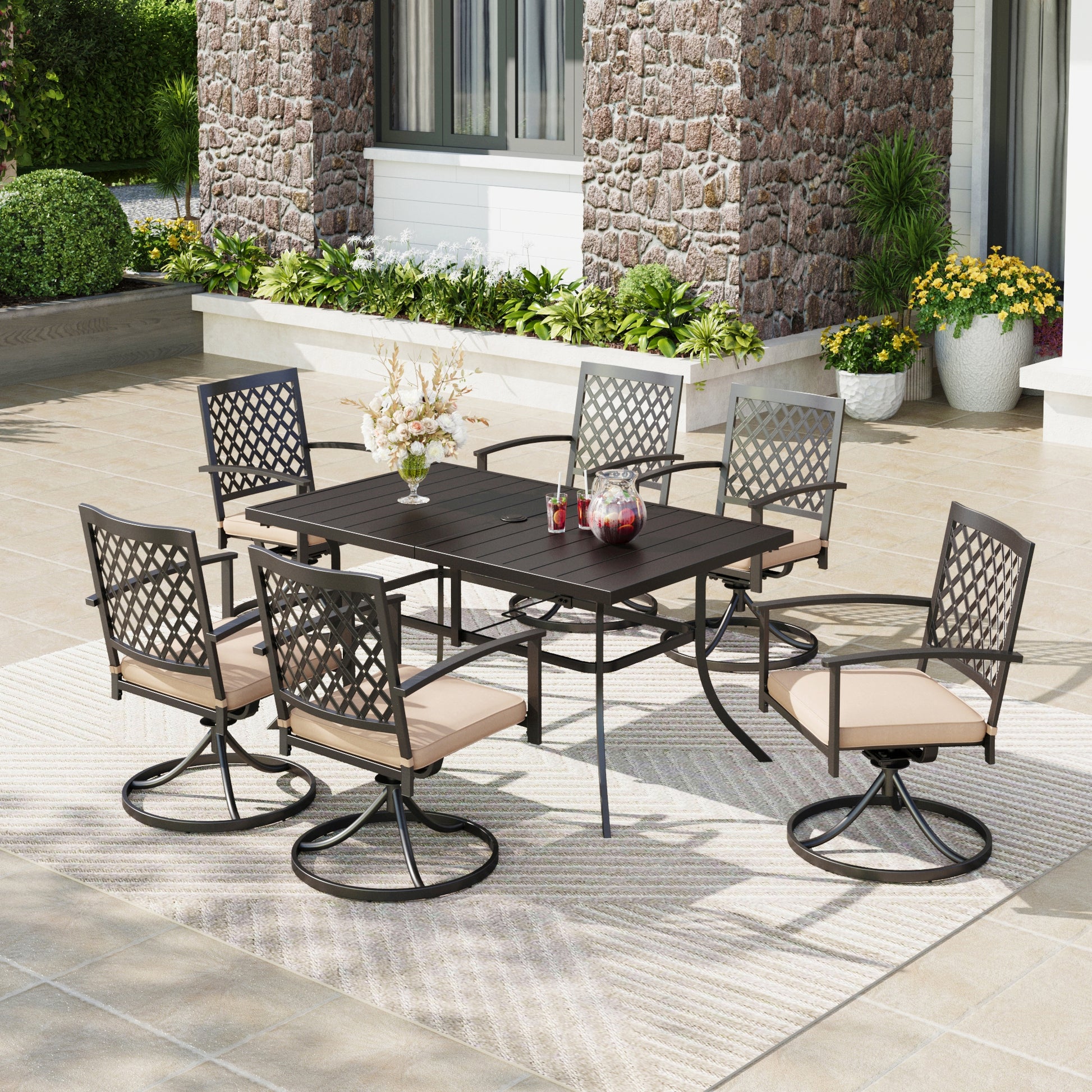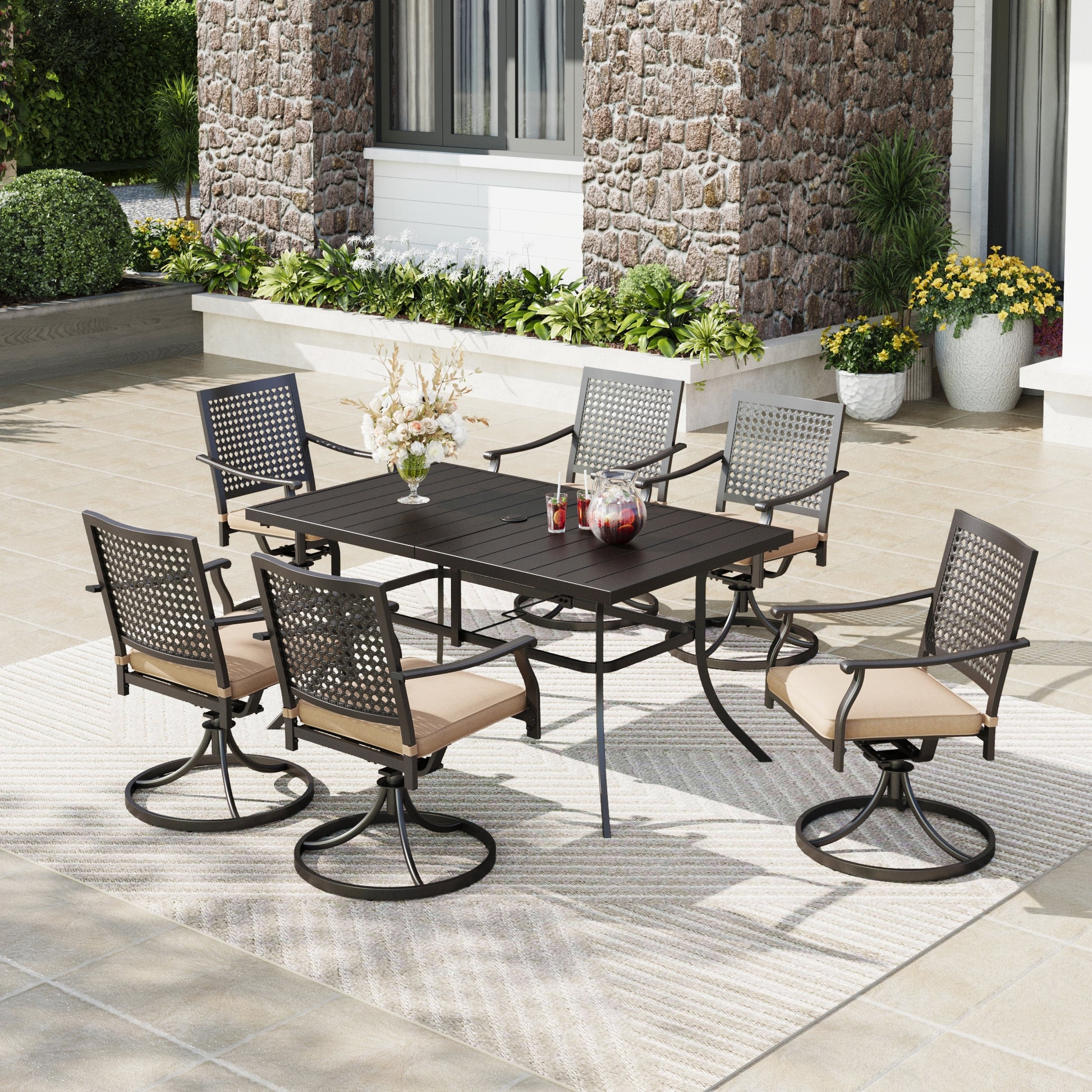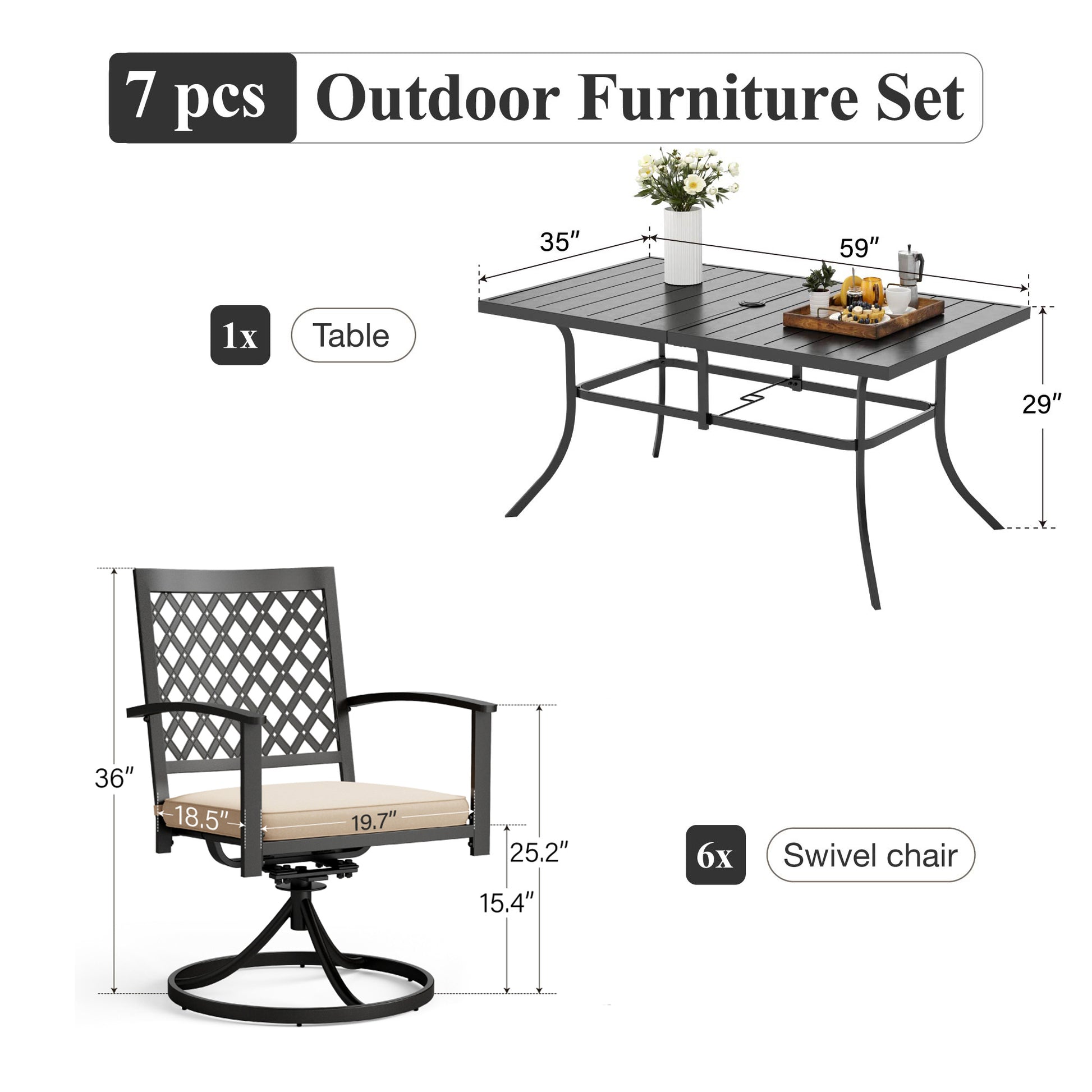 [<b>CAPTIVA DESIGNS</b>] 使用我们的 7 件套户外餐桌套装提升您的户外空间,它是现代户外生活的典范。这款金属矩形桌子专为现代生活而设计,配有板条桌面和随时可用的伞孔。