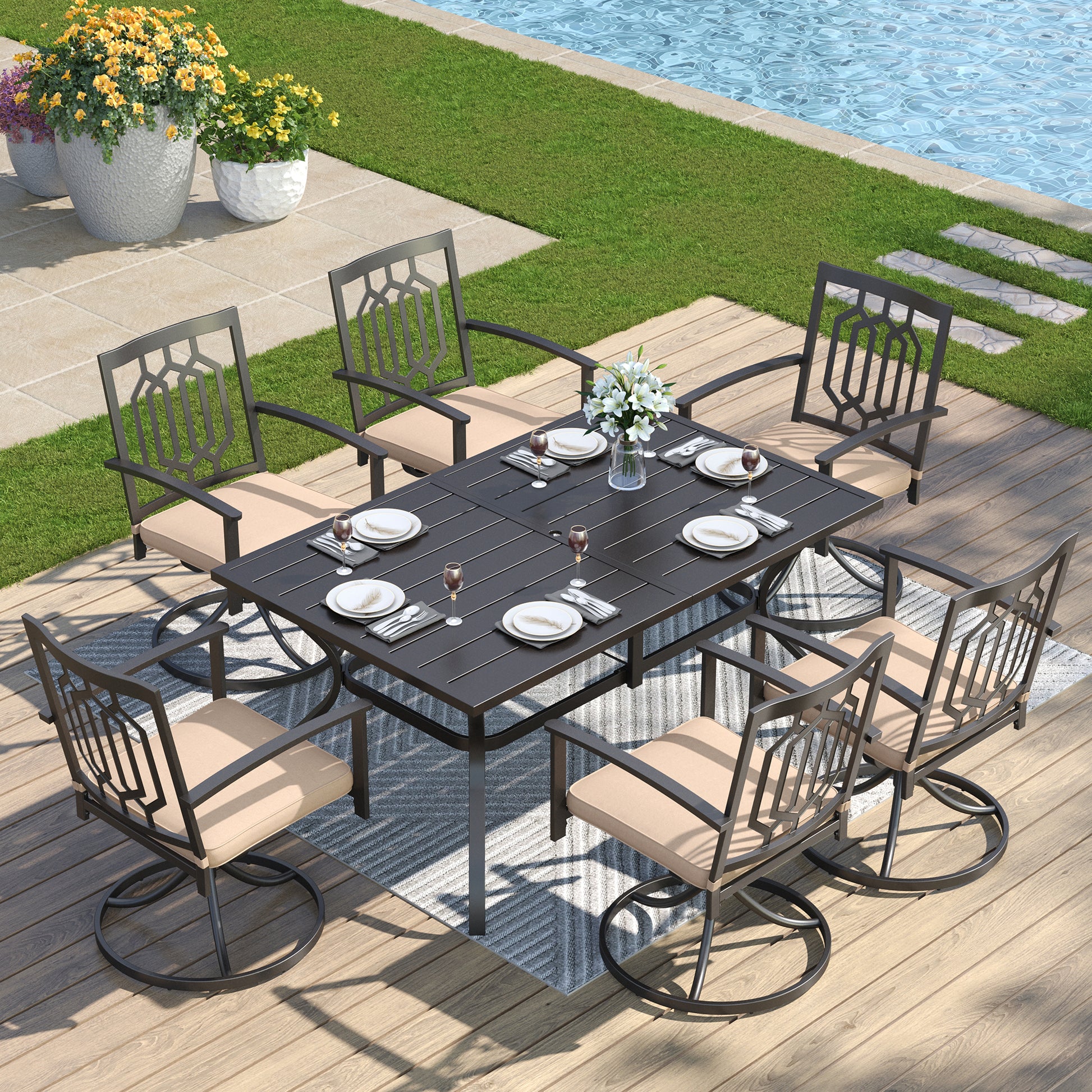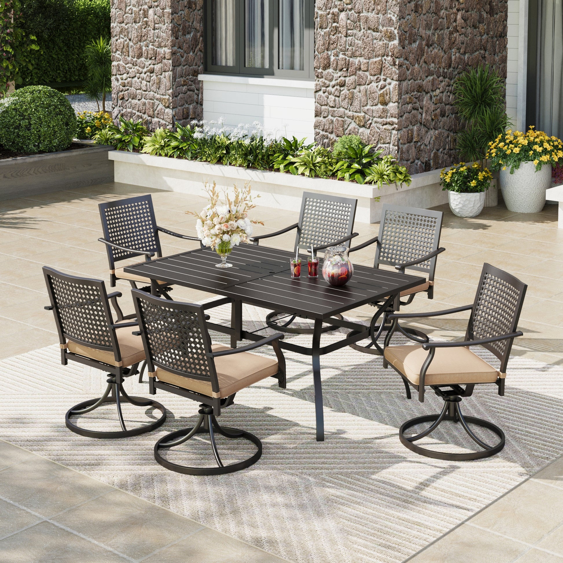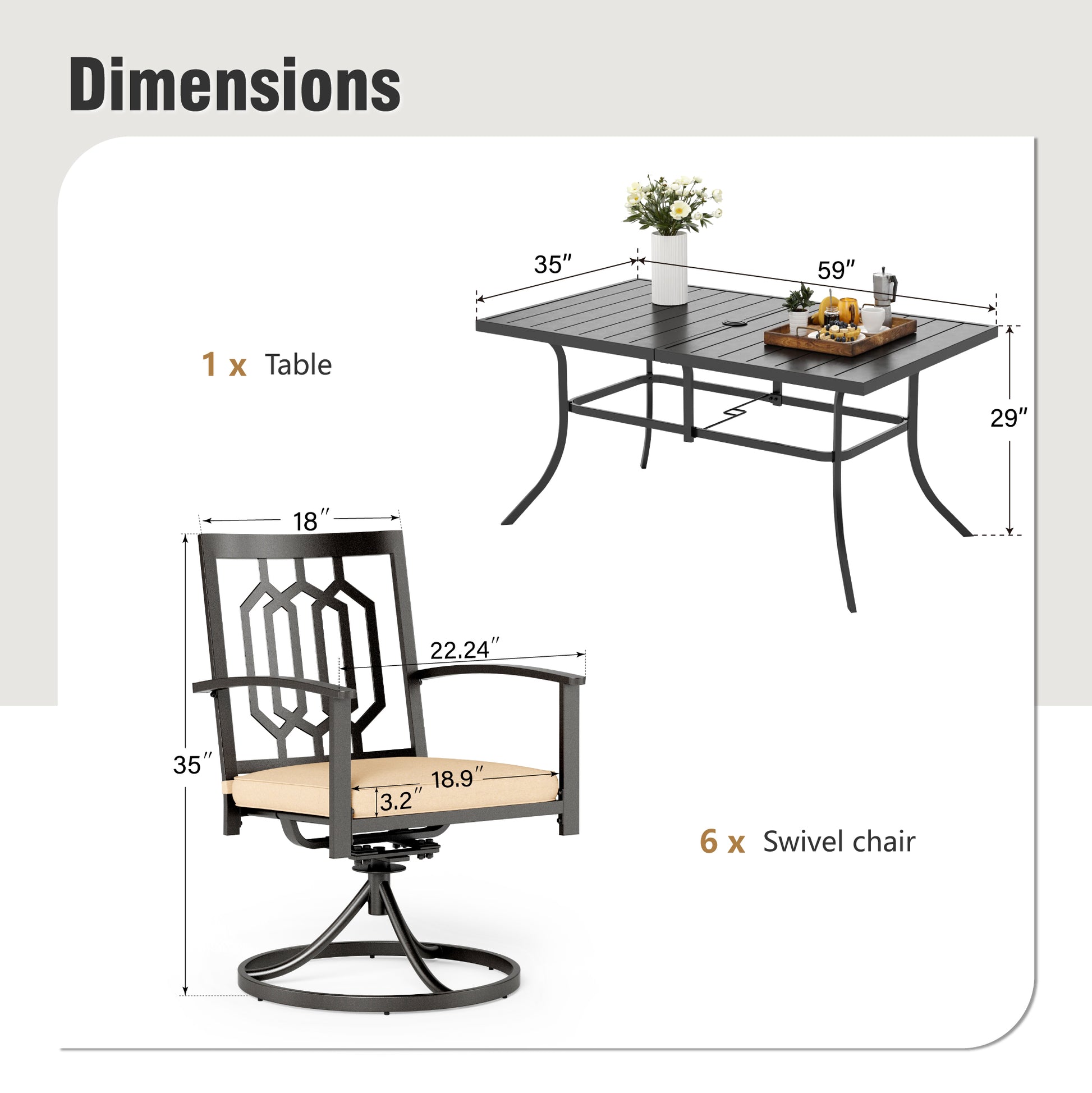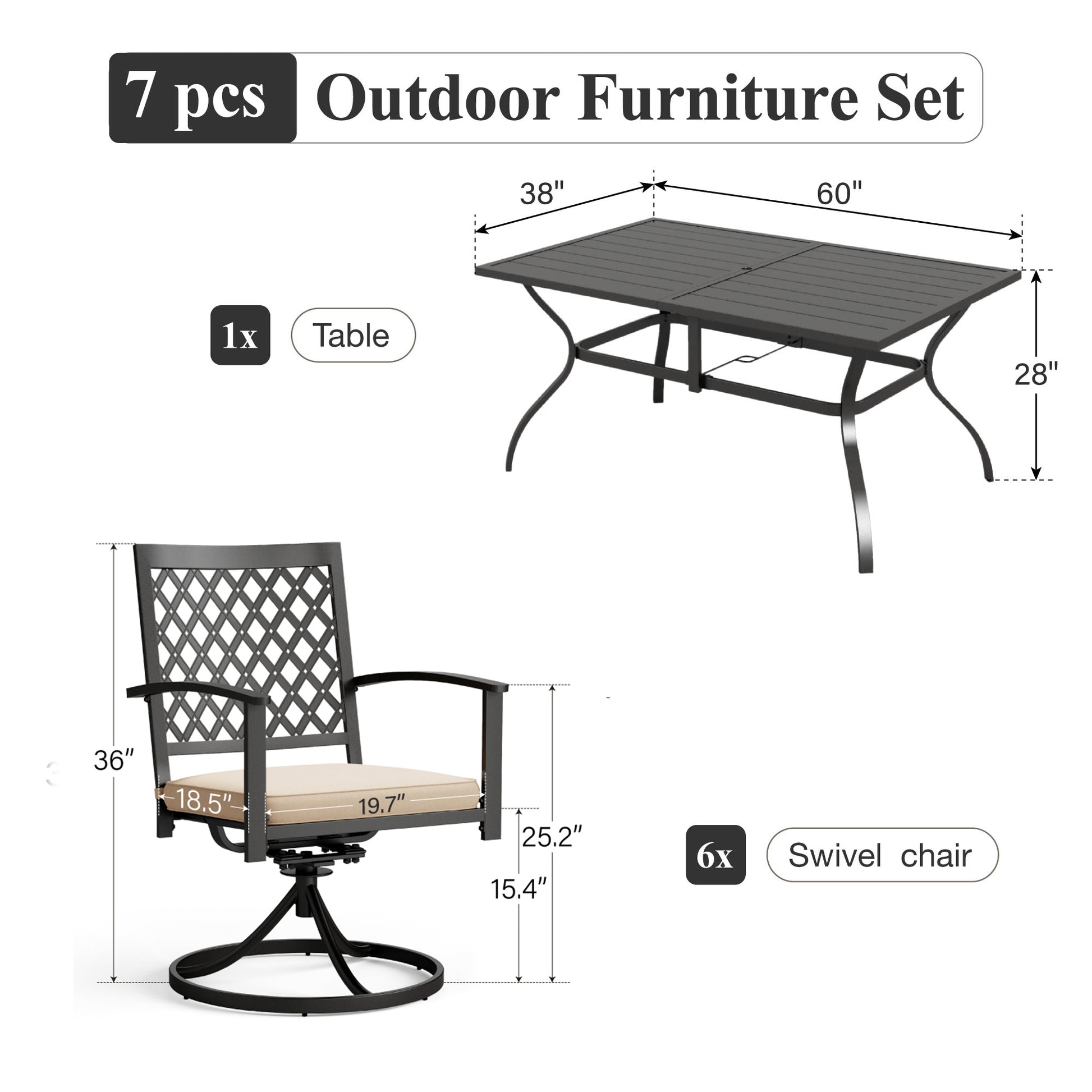 [<b>CAPTIVA DESIGNS</b>] 使用我们的 7 件套户外餐桌套装提升您的户外空间,它是现代户外生活的典范。这款金属矩形桌子专为现代生活而设计,配有板条桌面和随时可用的伞孔。