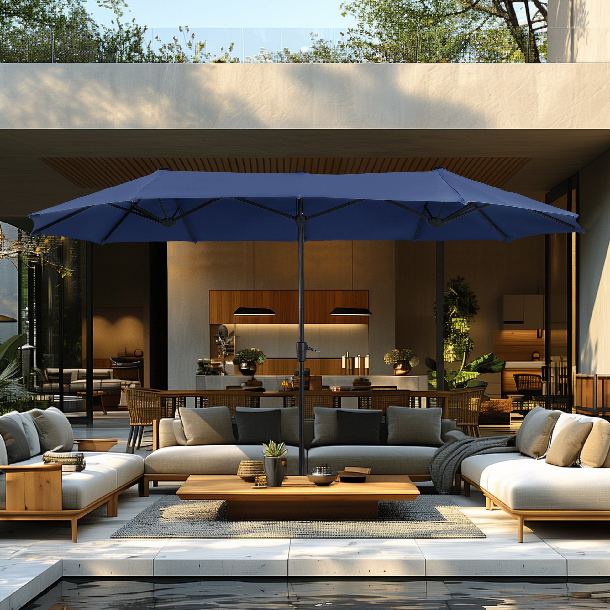 <b>充足的阴凉和卓越的稳定性:</b>宽大的 13 英尺市场遮阳伞具有 12 根坚固的钢骨,具有出色的稳定性,而其 180g 防水涤纶面料可提供紫外线防护,确保您的户外聚会舒适安全。