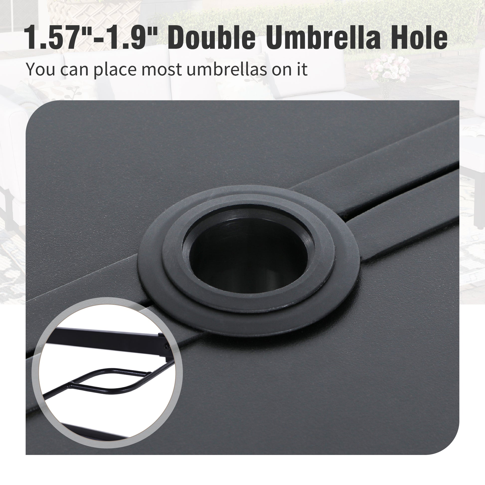 <b>方便的伞孔:</b>钢桌设有内置伞孔,让您在阳光明媚的日子里在阴凉处享用餐点。