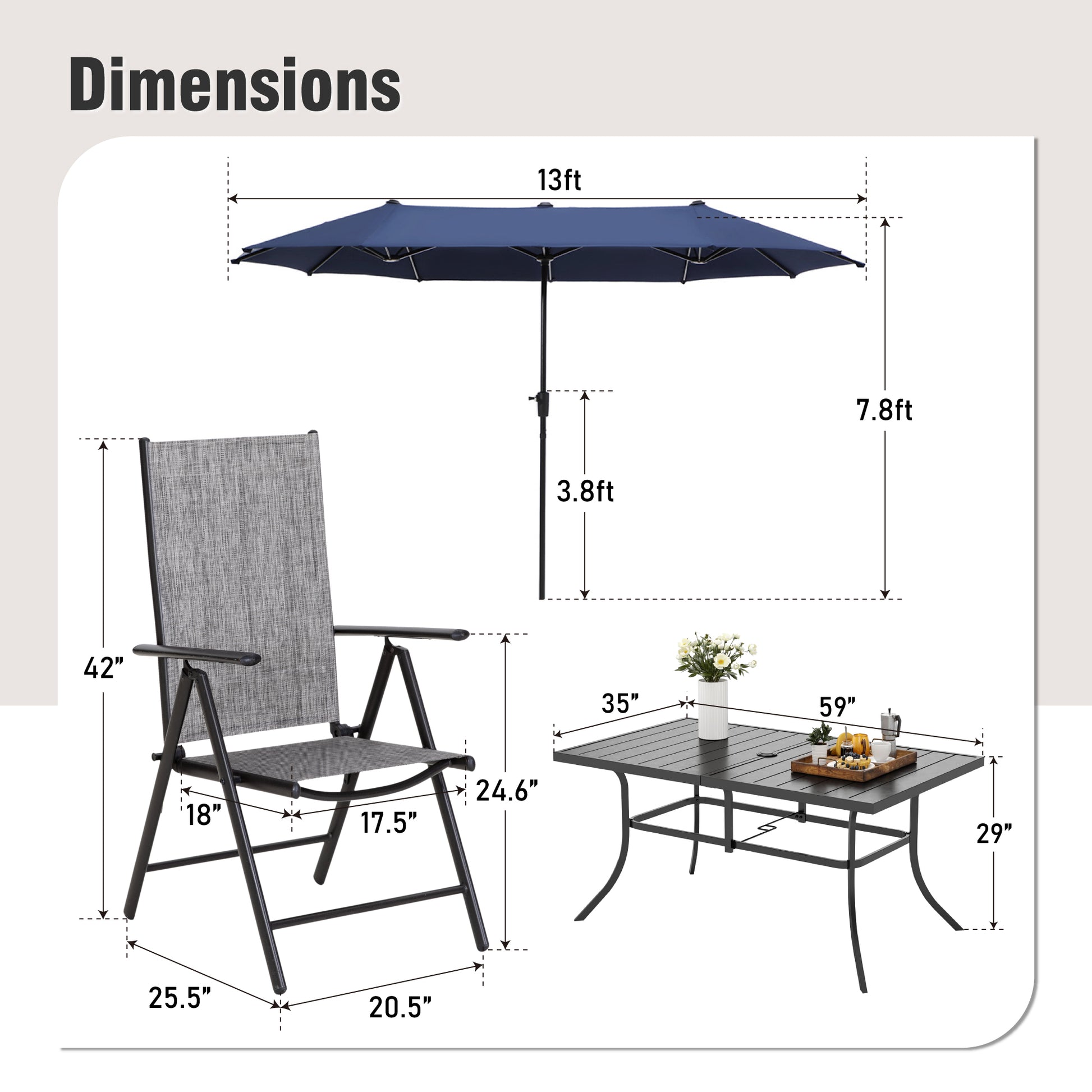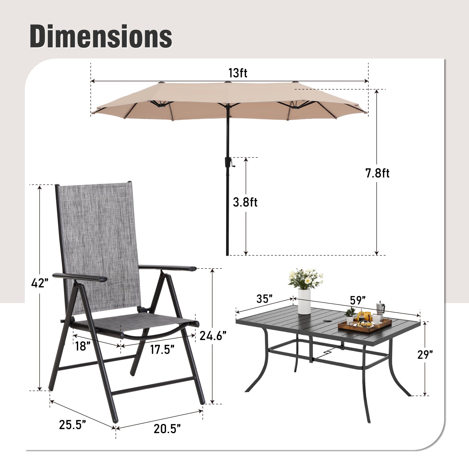 Captiva Designs 8 件套露台板条矩形桌、Textilene 可躺折叠椅和 13 英尺大号米色遮阳伞