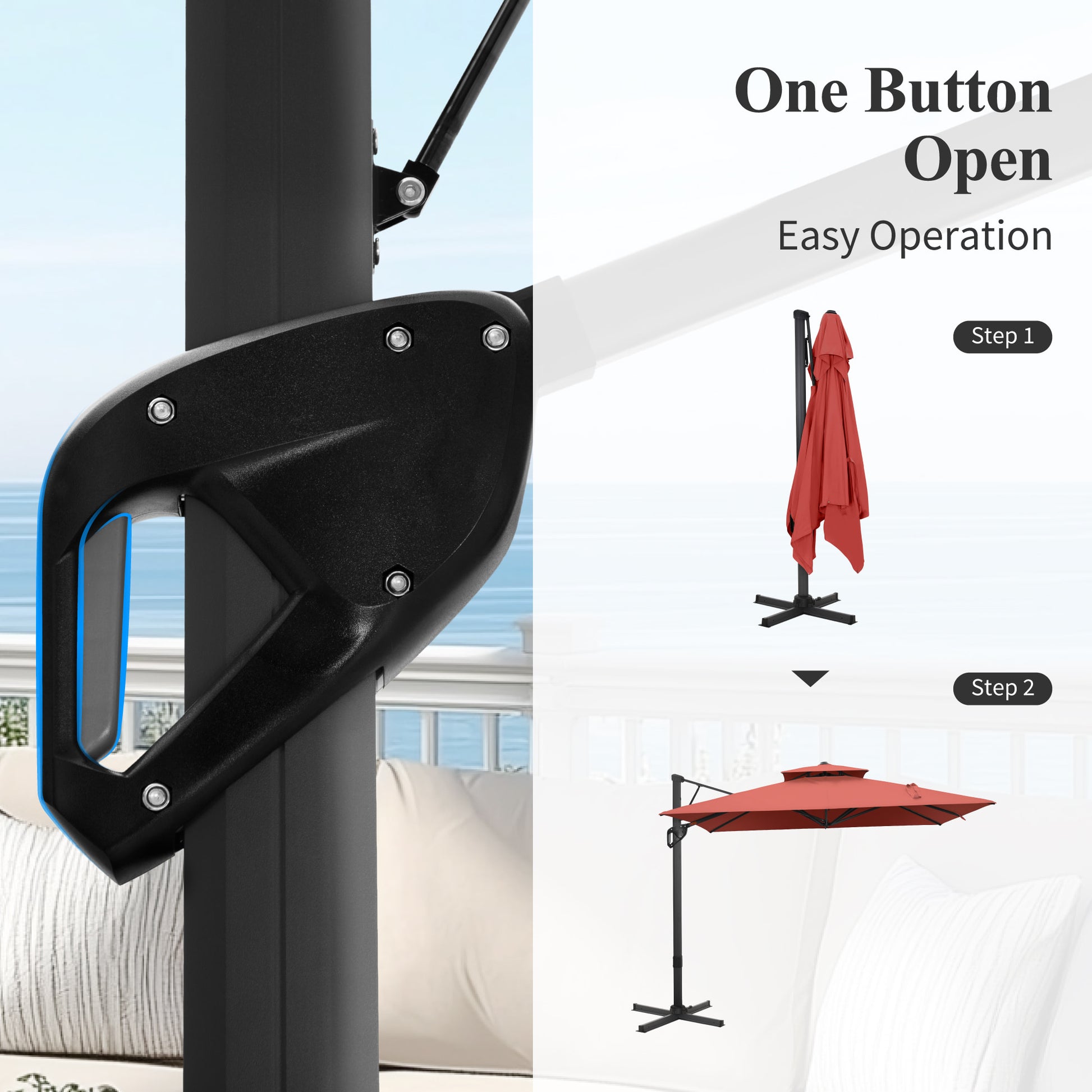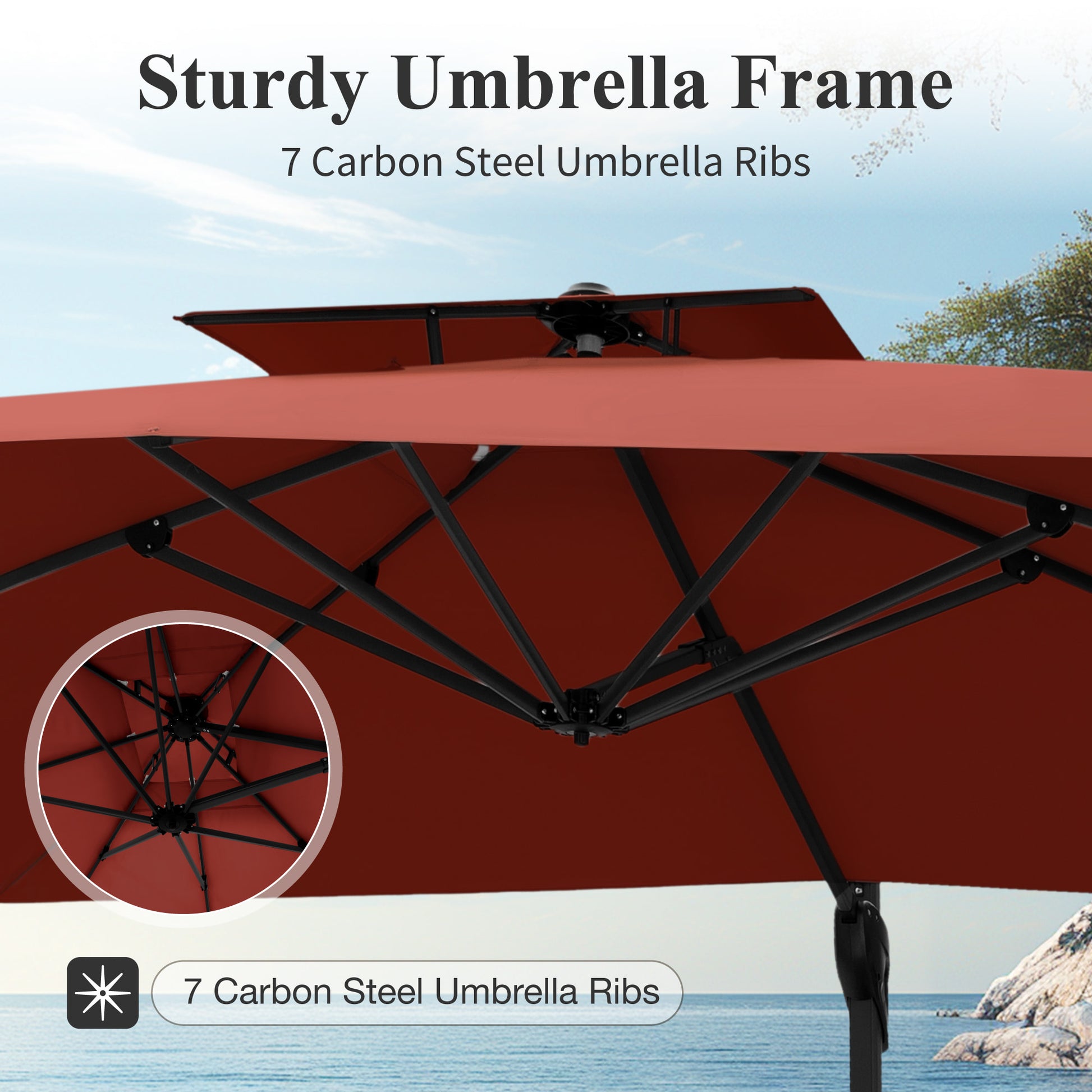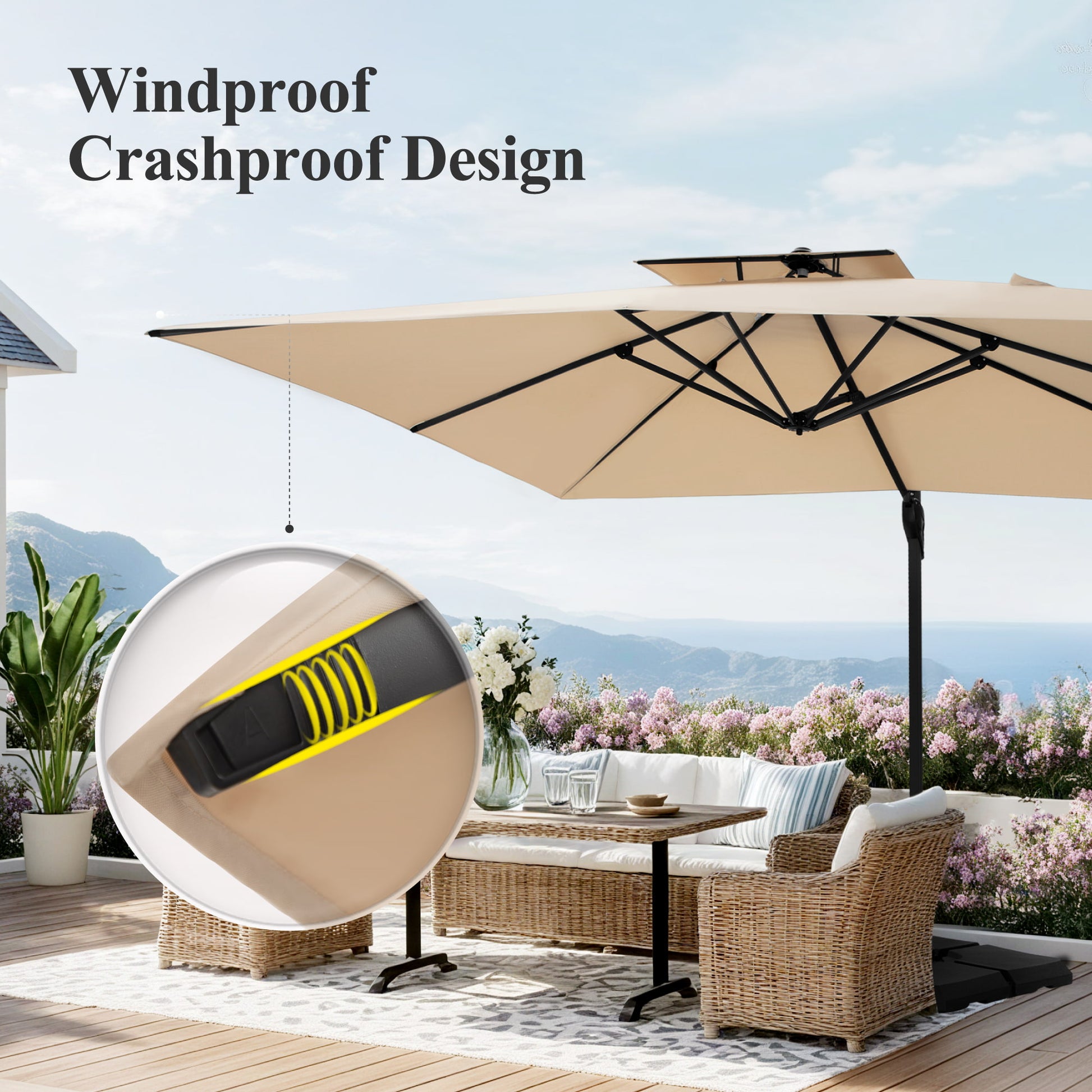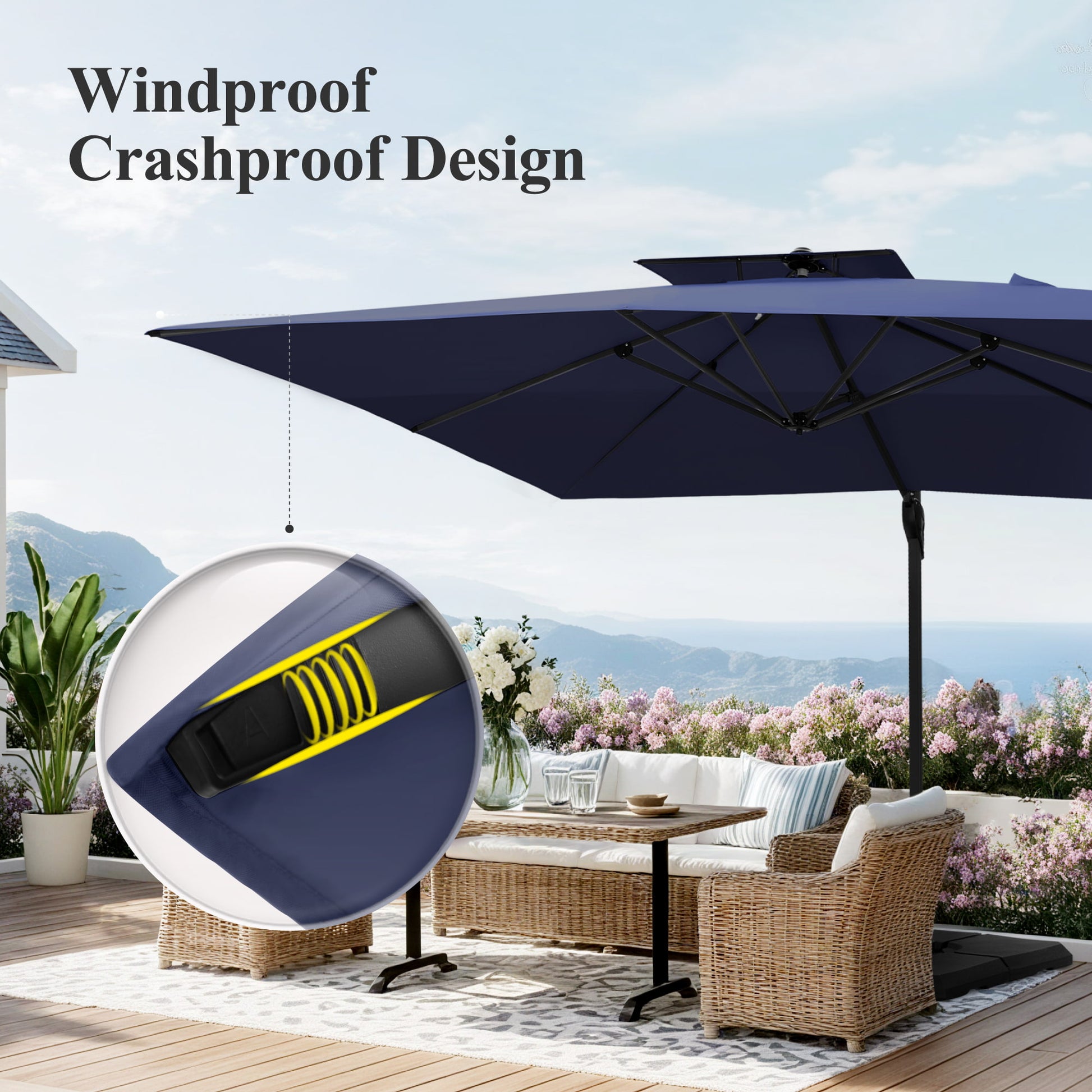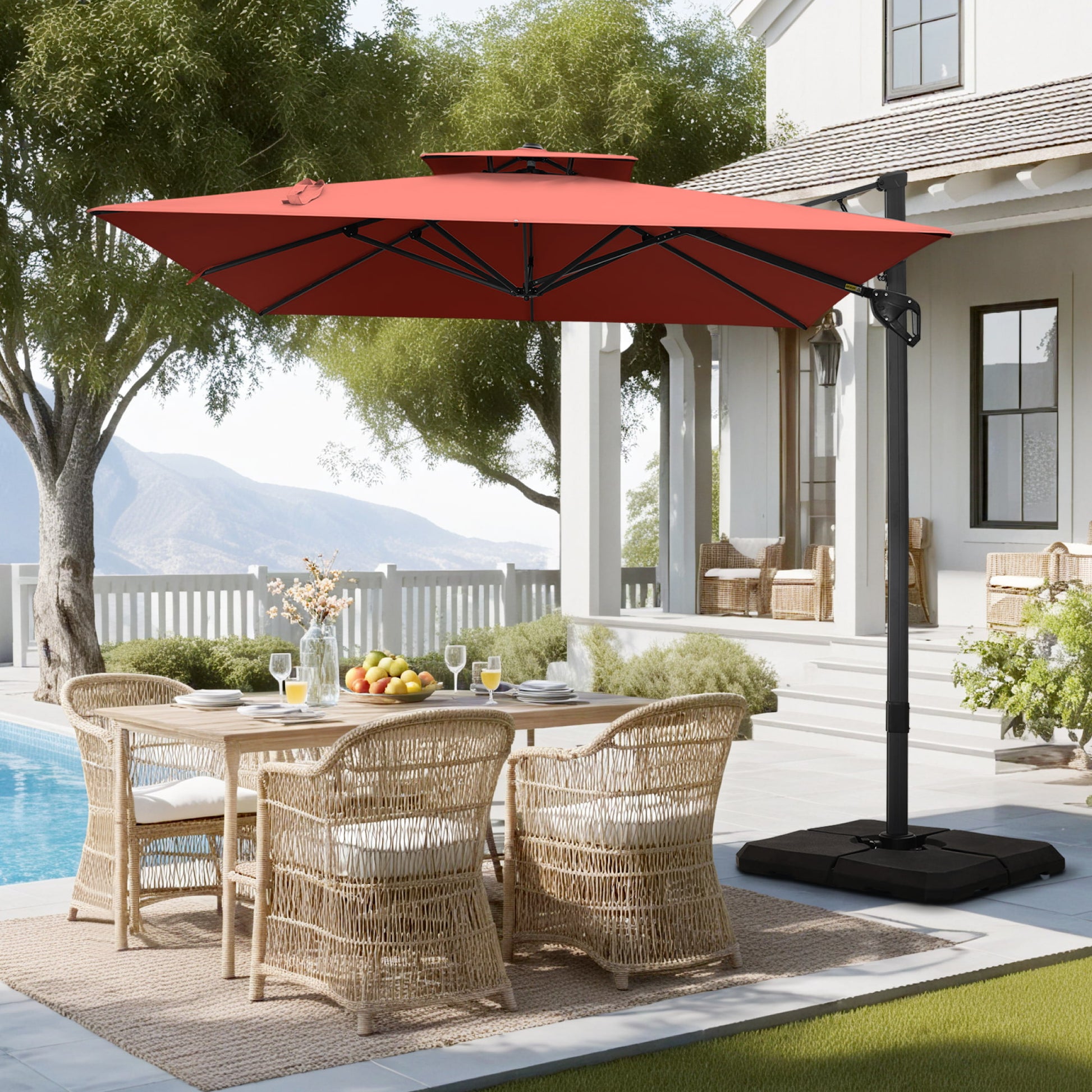 Transform your outdoor living area with our 9 ft x 12 ft Premium Cantilever Patio Umbrella. This beautifully designed umbrella combines elegance with practicality, featuring a sturdy triangular structure and a unique double-top design that provides outstanding stability and airflow. Perfect for enhancing patios, gardens, and poolside settings, it delivers ample shade while adding a touch of sophistication to your outdoor environment.