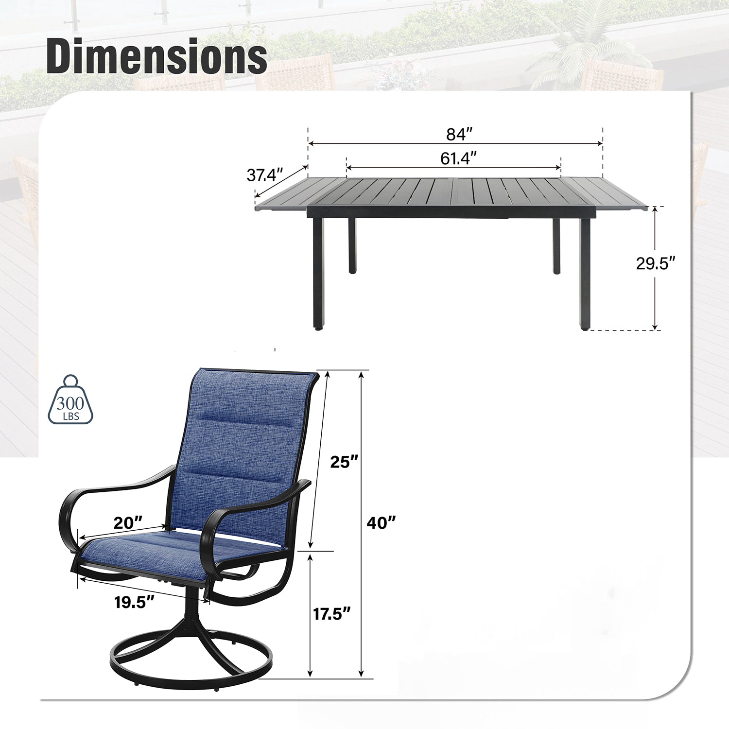 Captiva Designs 9 件套露台餐桌椅套装,配有可调节钢制长方形餐桌和蓝色软垫 Textilene 旋转椅