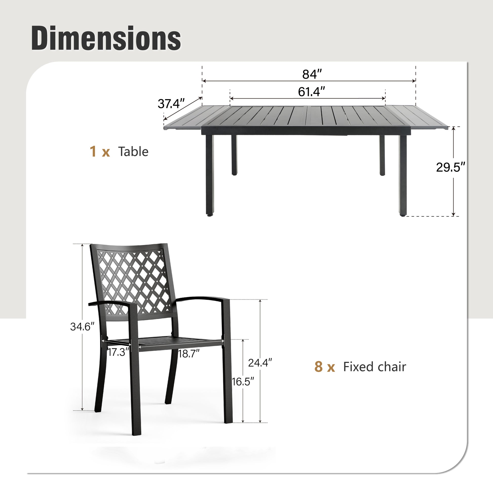 [<b>CAPTIVA DESIGNS</b>] 使用我们的 Captiva Designs 9 件套露台餐桌套装提升您的户外用餐体验。该套装专为现代生活而设计,配有一张重型金属矩形桌子,顶部带板条,表面采用粉末涂层。它最多可容纳 8 人,可轻松扩展至 83.8 英寸,适合举办大型聚会。它防锈防水,是任何户外空间的完美补充。