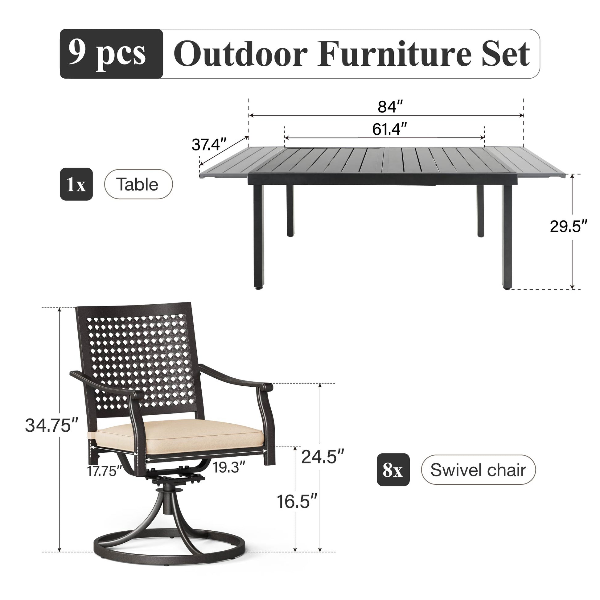 [<b>CAPTIVA DESIGNS</b>] 使用我们的 Captiva Designs 9 件套露台餐桌套装提升您的户外用餐体验。该套装专为现代生活而设计,配有一张重型金属矩形桌子,顶部带板条,表面采用粉末涂层。它最多可容纳 8 人,可轻松扩展至 83.8 英寸,适合举办大型聚会。它防锈防水,是任何户外空间的完美补充。