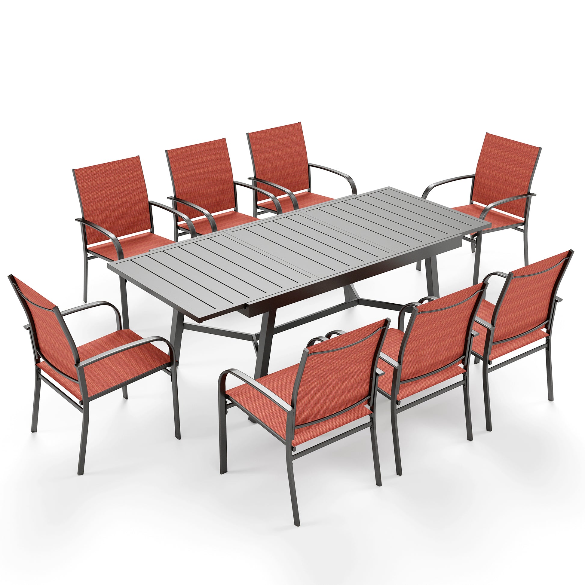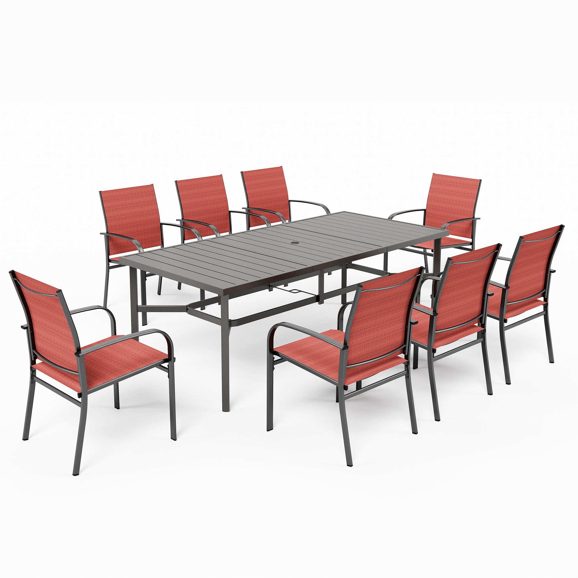 Captiva Designs 9 件套宽敞板顶矩形金属桌,带伞孔和棕色 Textilene 椅子