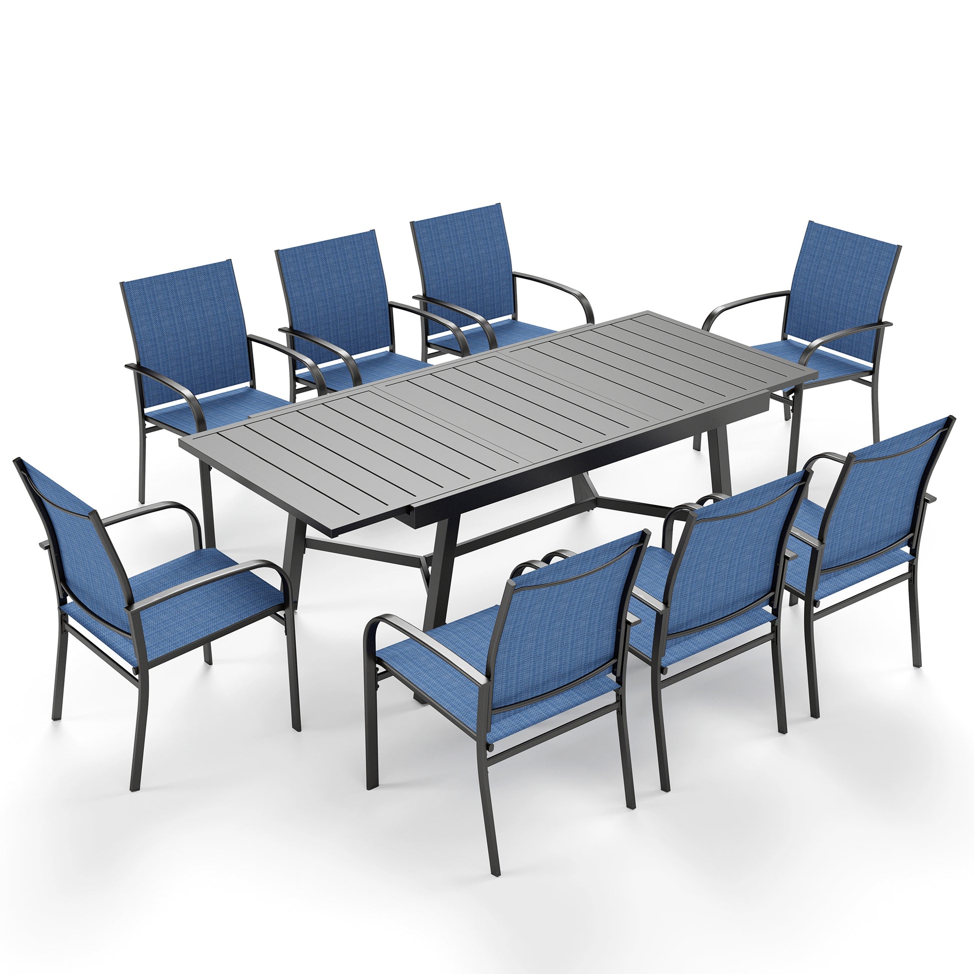 [<b>CAPTIVA DESIGNS</b>]我们的 82.7 英寸 x 39.4 英寸的矩形金属桌可为您的户外用餐增添光彩,其顶部采用板条设计,可防止积水,便于维护。这款桌子配有 1.7 英寸预切伞孔,可防紫外线,兼具实用性和时尚感。