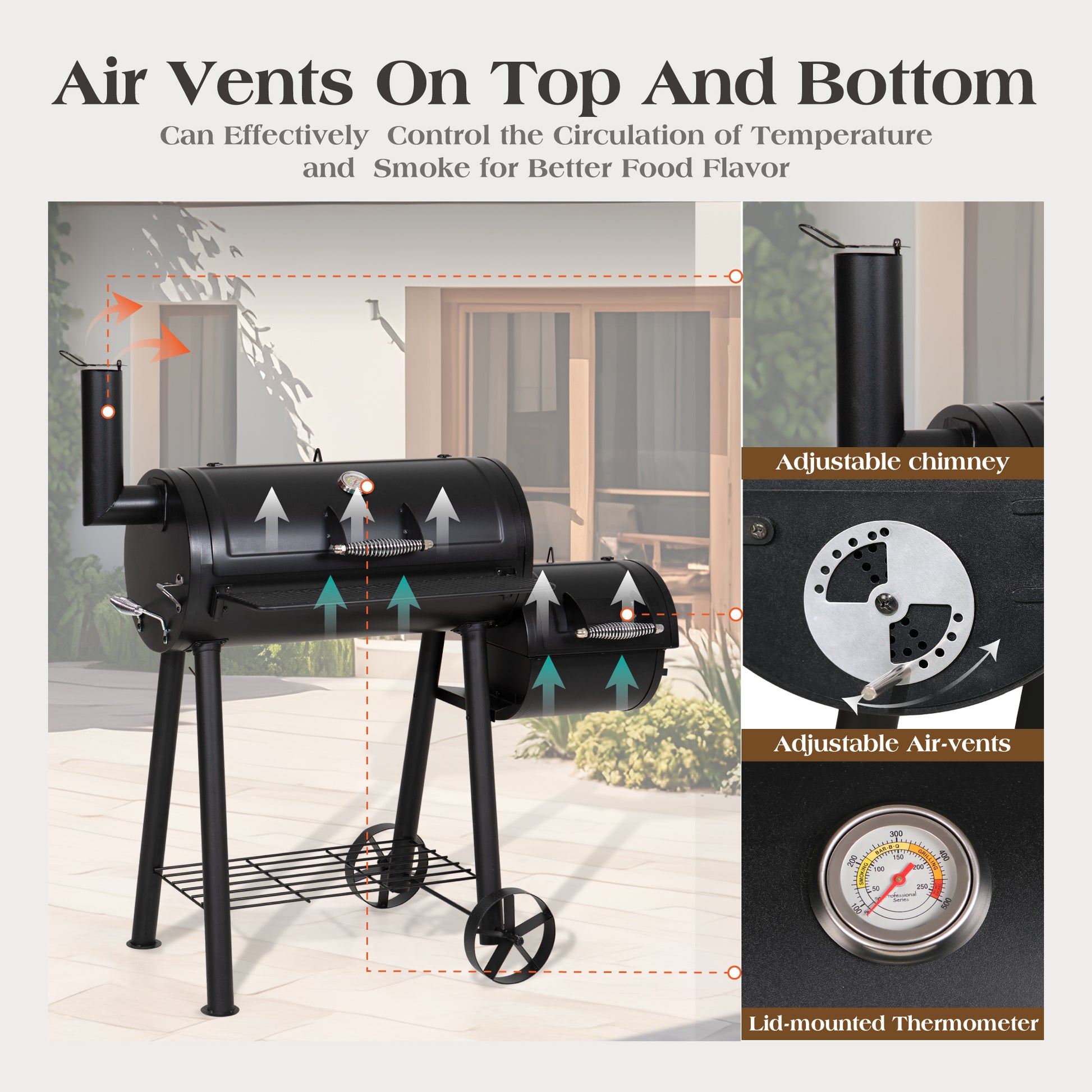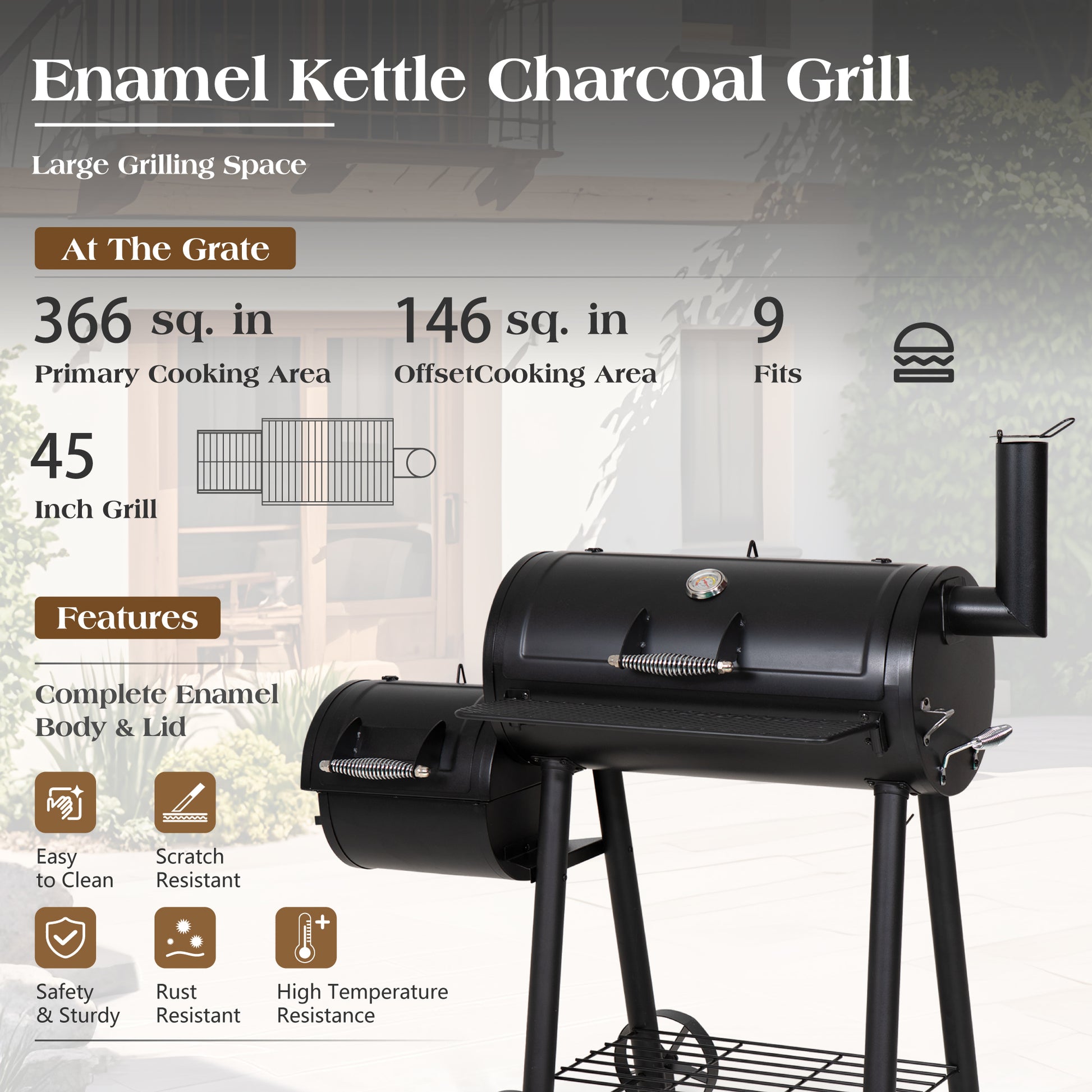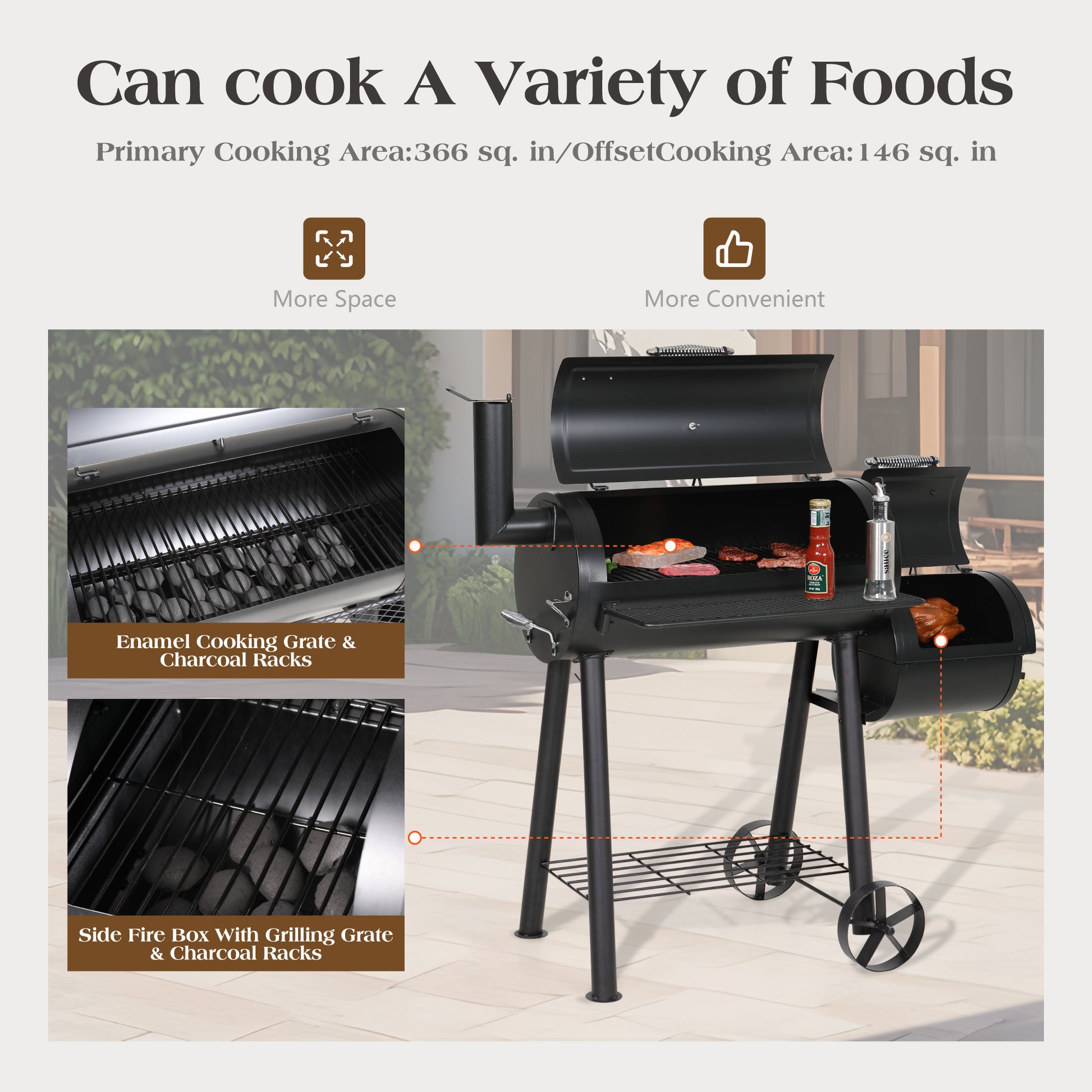 宽敞的烹饪区:提供总共 512 平方英寸的烹饪空间,包括 366 平方英寸的主烹饪区和 146 平方英寸的偏置烟熏炉,可用于多种户外烹饪。
